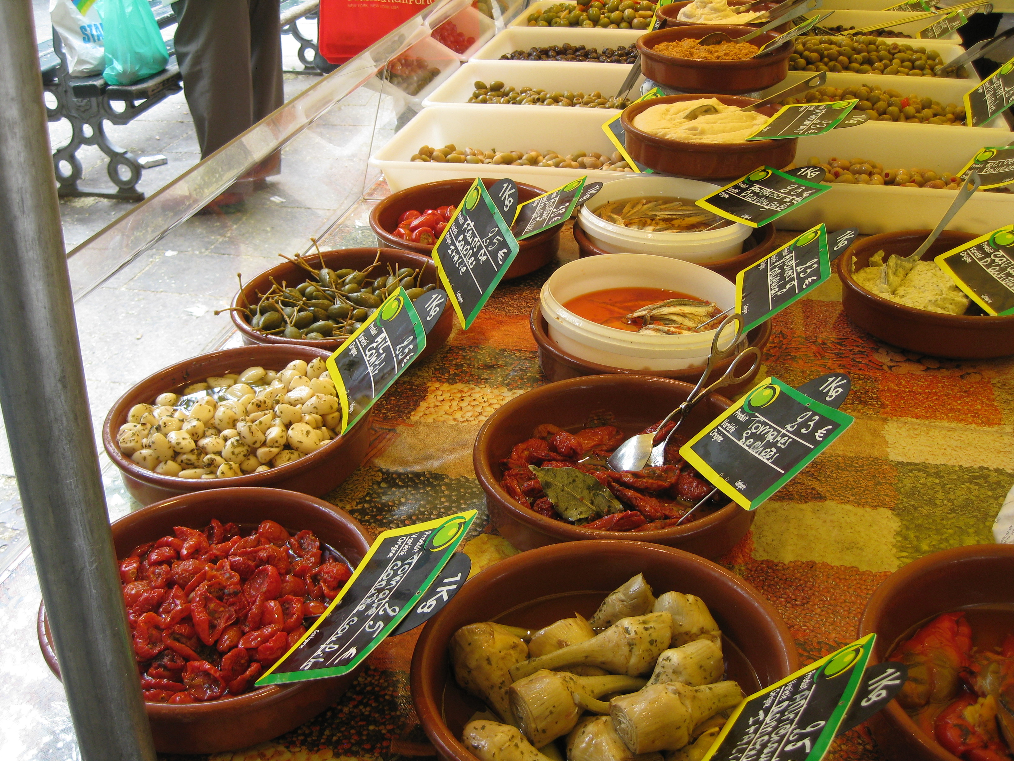 Olives and roasted goodies at the market.