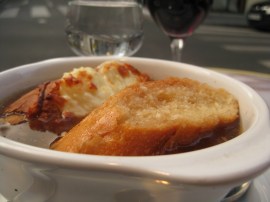French Onion Soup at a sidewalk cafe.