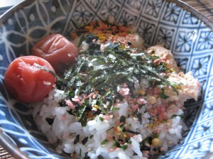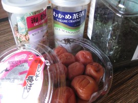 Ebi (shrimp) and Wakame (seaweed) furikake, Kizami-nori, and Umeboshi (pickled plums)