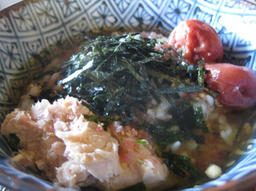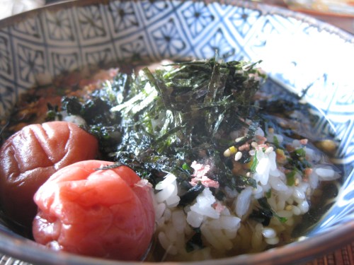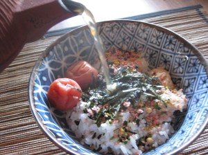 It might seem a little odd to pour green tea over rice– my roommate was skeptical that I wasn’t just making the whole thing up, until I wikipedia-ed it for her– but the flavors all blend together so nicely, you will not even notice that you are getting caffeinated by the slurp. Not to mention, brewing a pot of tea is much much easier than extracting your own seaweed dashi or fish dashi, or simmering up some other stock for soup broth.
