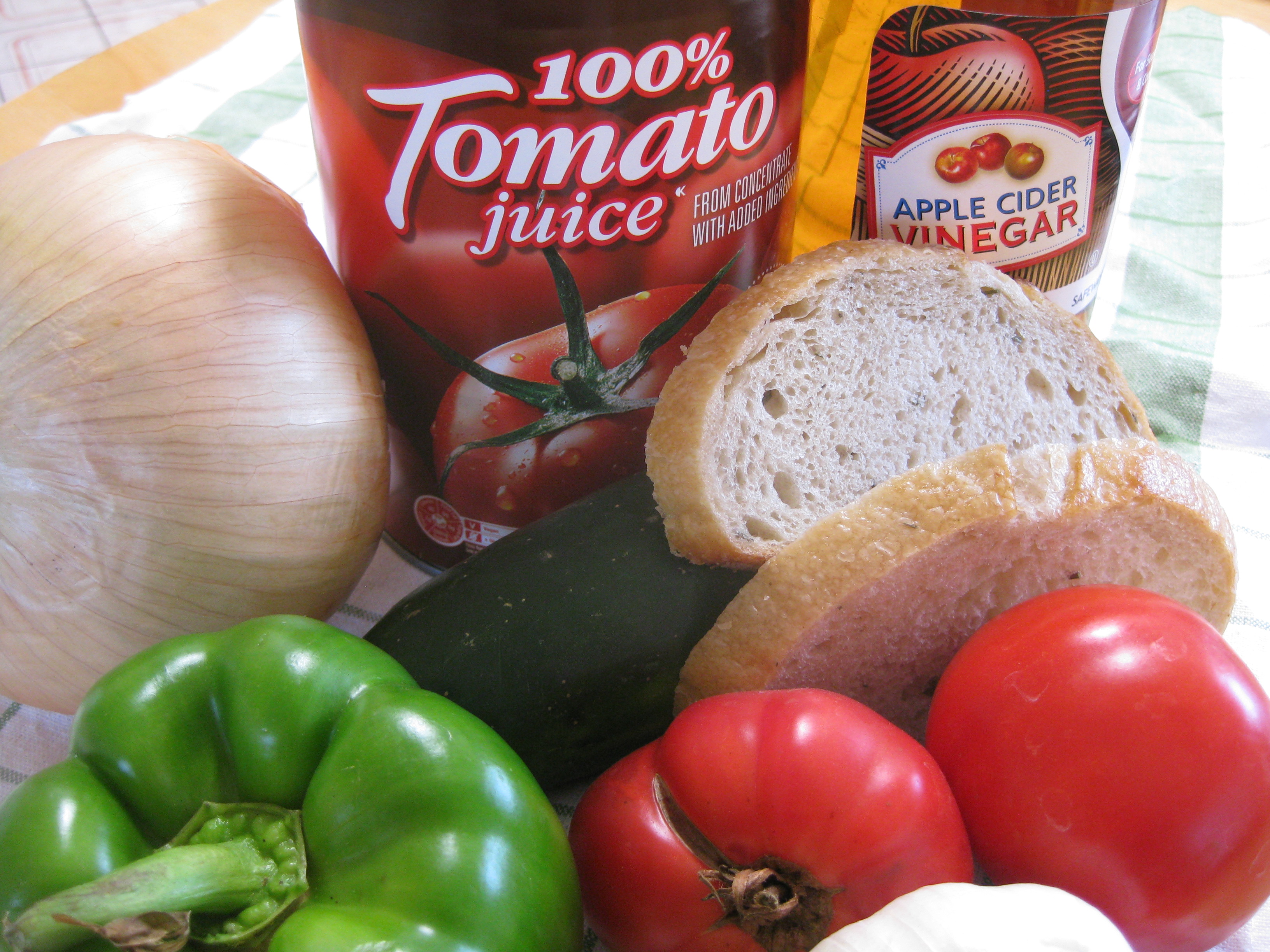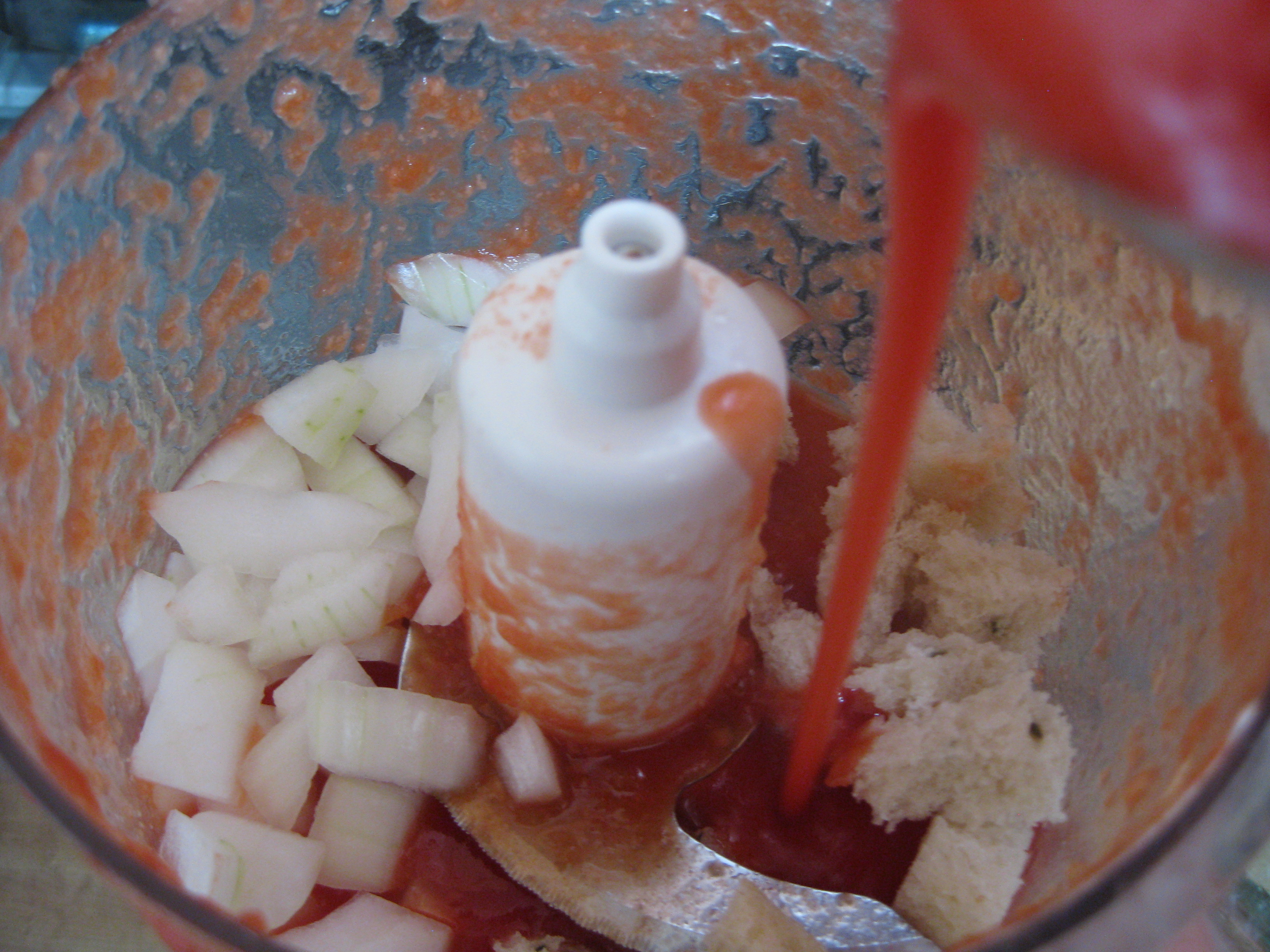 1. Pour a cup or two from the can of tomato juice into a blender or food processor. Add chopped onion and the torn-up bread slice(s). (And, optionally, basil or garlic.) Blend until nearly smooth.