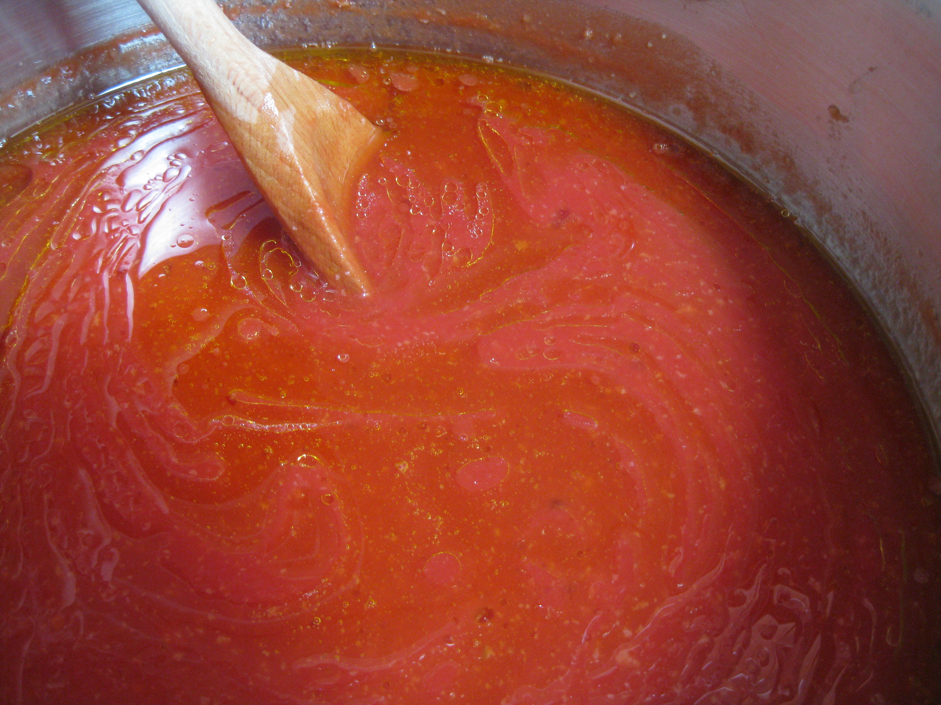 I used the wine vinegar instead of the cider vinegar, which I thought was good. And I used fresh tomatoes for step one–I left the skins on, actually, then put them in the cuisanart and then pushed the whole mess through a strainer to get rid of the seeds.