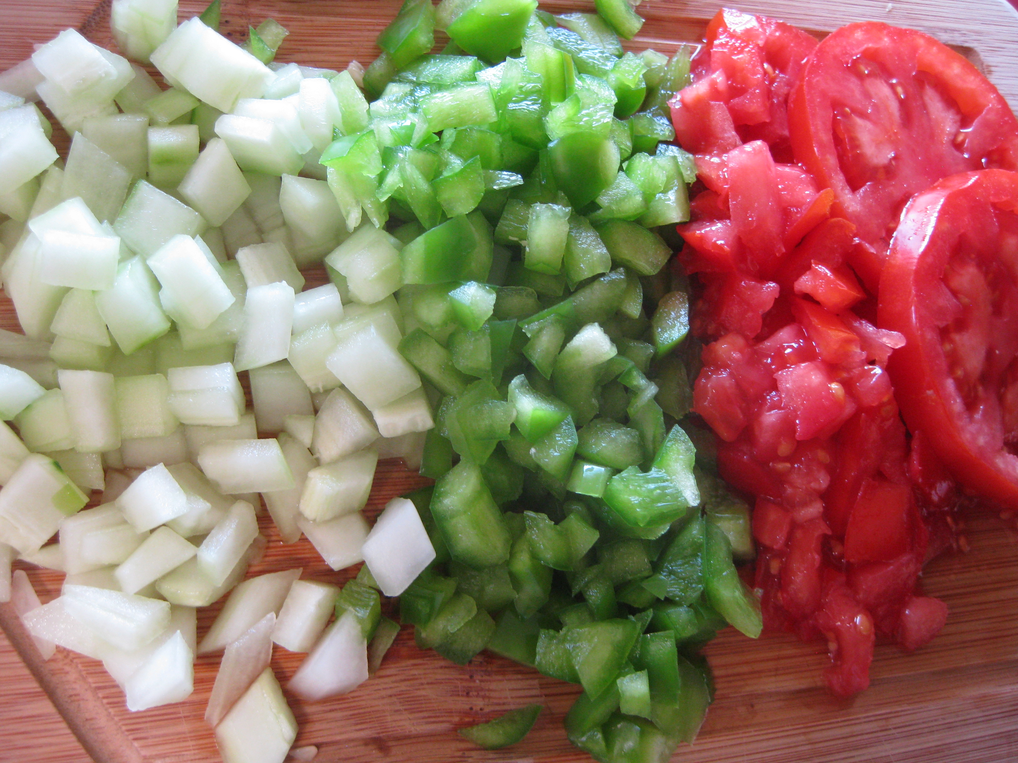 3. Finely dice one or two fresh tomatoes and any other optional crunchy additions to the soup: I add diced tomatoes, cucumber, and green pepper; some people also add diced onion or celery.