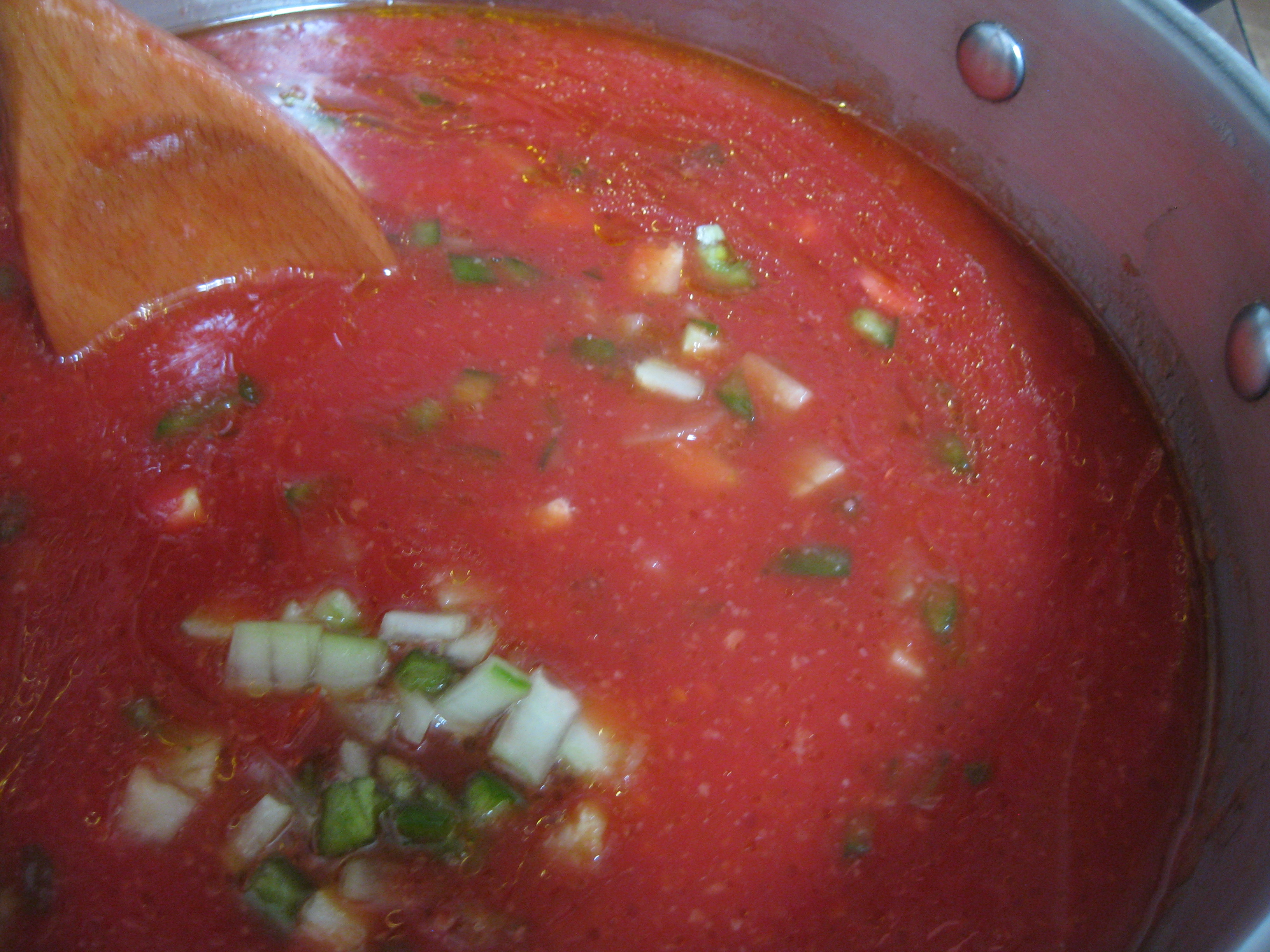 ~ 1 large can tomato juice (or V8, or 6-8 ripe tomatoes, peeled, chopped, blended, and strained of seeds)