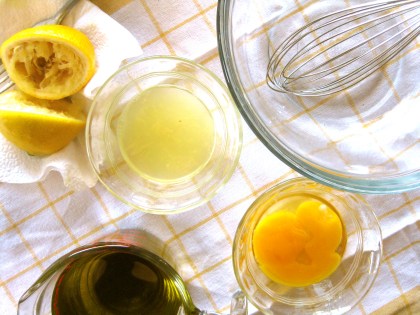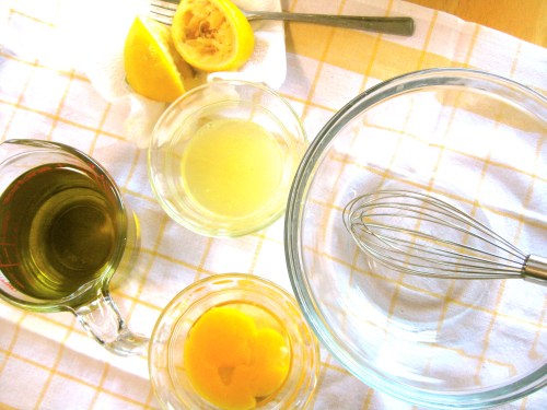 Making your own fresh mayonnaise at home is worth it, especially if you have an electric mixer, like I don’t. The thing with making mayonnaise is that you want to whisk the oil into the egg yolks to make an emulsion (i.e., you want the sauce to thicken into something blended, creamy, and opaque, rather than separating out into translucent oil versus egg). To accomplish this, you have to add the oil only a FEW DROPS at a time. Apparently (according to multiple internet sources, such as this one), if you pour in the oil too quickly, your mayonnaise will separate, into an eggdrop soup.***