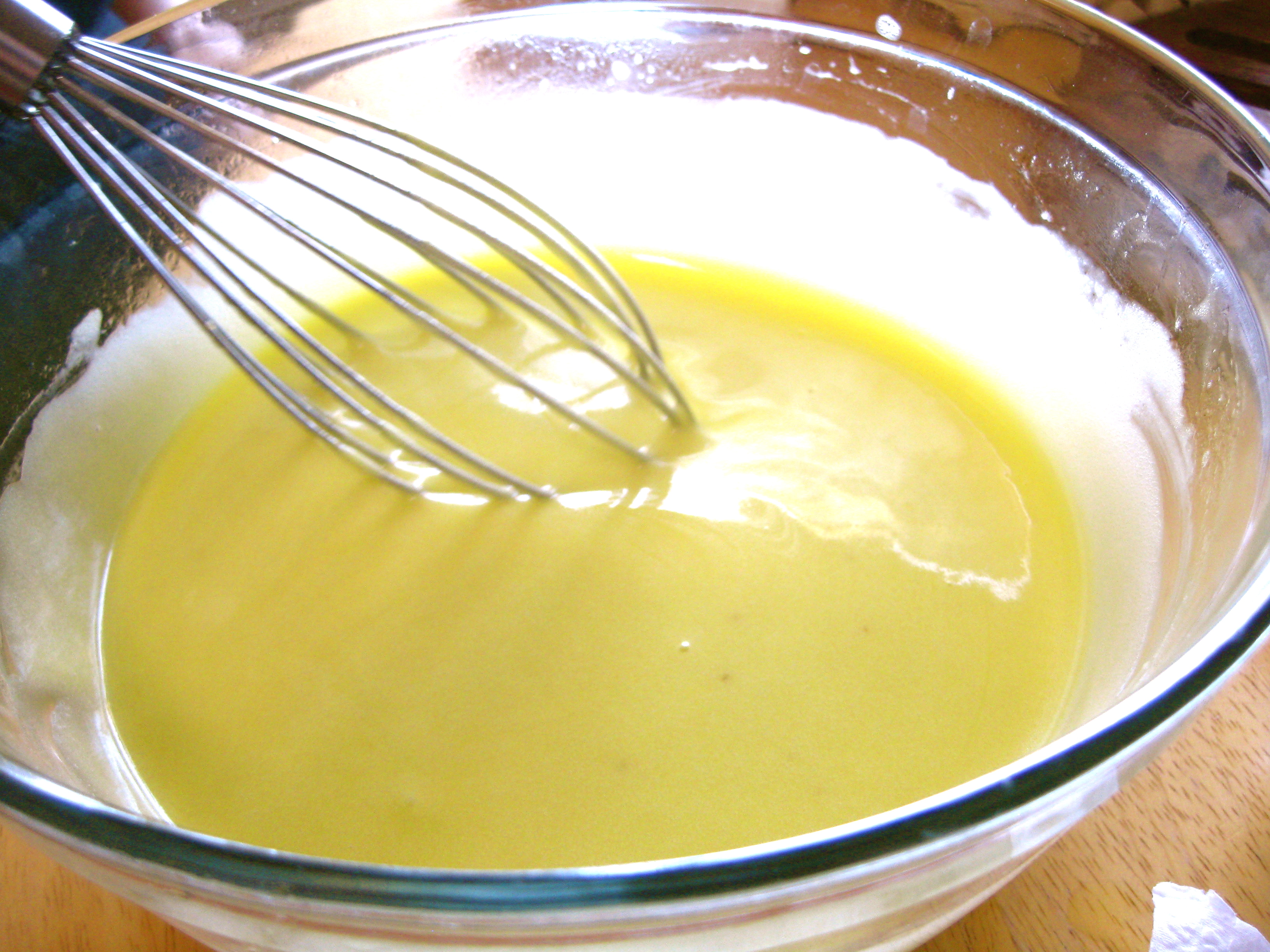 So (other than remembering to bring all of your ingredients to room temperature!) this is the time-consuming part: add the oil only a few drops at a time, while whisking, and make sure that it is all fully emulsified each time before adding any more oil.**** Now you see where the electric whisk or mixer would have come in handy… The more oil you add (presumably up to a certain point when the emulsion collapses) the thicker your sauce will become; you can tailor it to your taste by stopping any time or just whisking in a little extra oil.
