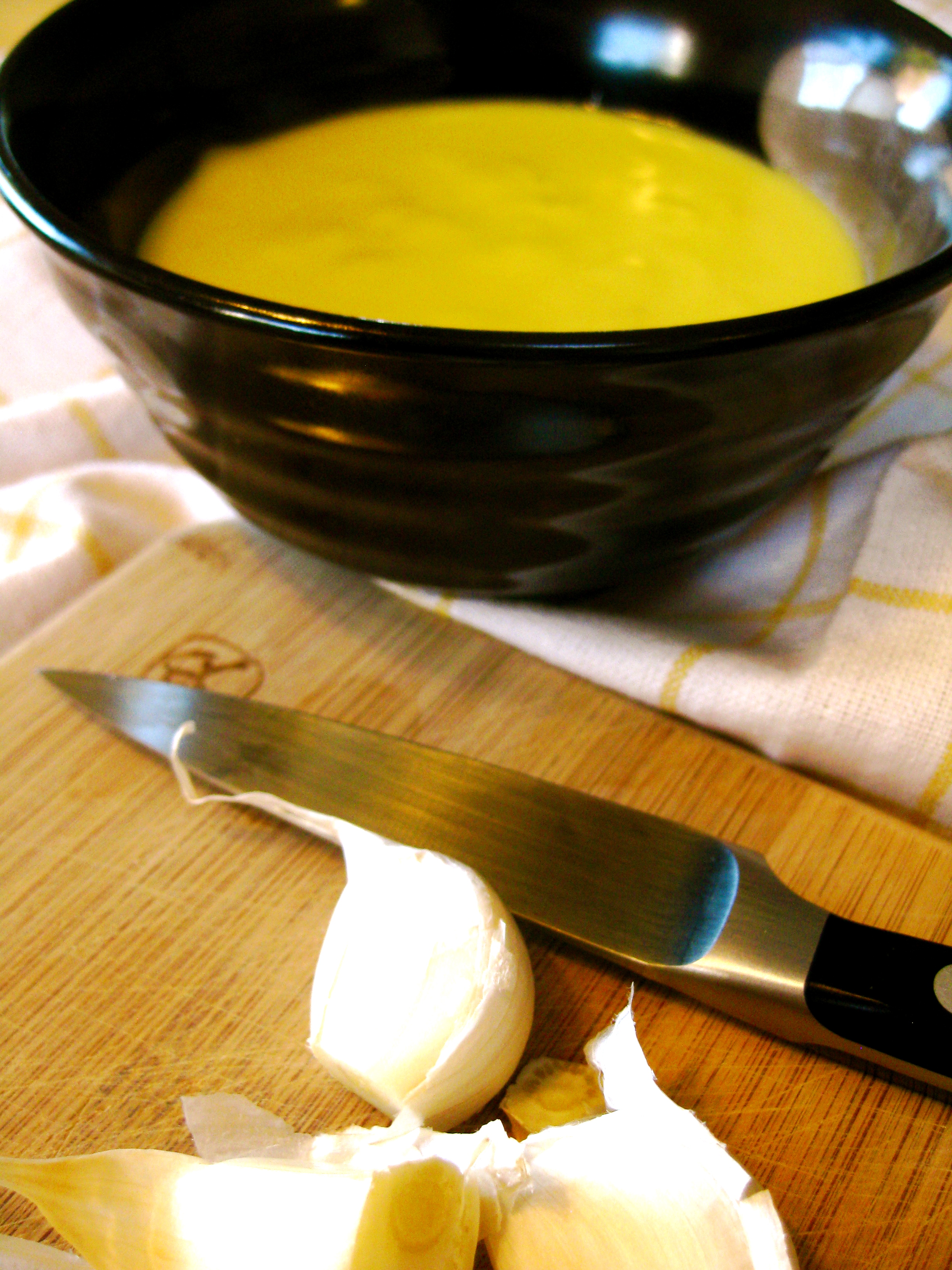 A note about the olive oil: I skimmed (& fell for) several alioli recipes that (in their show-off-y desire to be fancy and authentic) recommended Spanish Extra Virgin Olive Oil. If you give in to this fanciness, then your mayonnaise will continue to taste very strongly of olive oil, no matter how much garlic you attempt to mask that with. Next time I plan to use a much lighter, less flavorful oil instead, like sunflower oil, canola oil, or light olive oil.