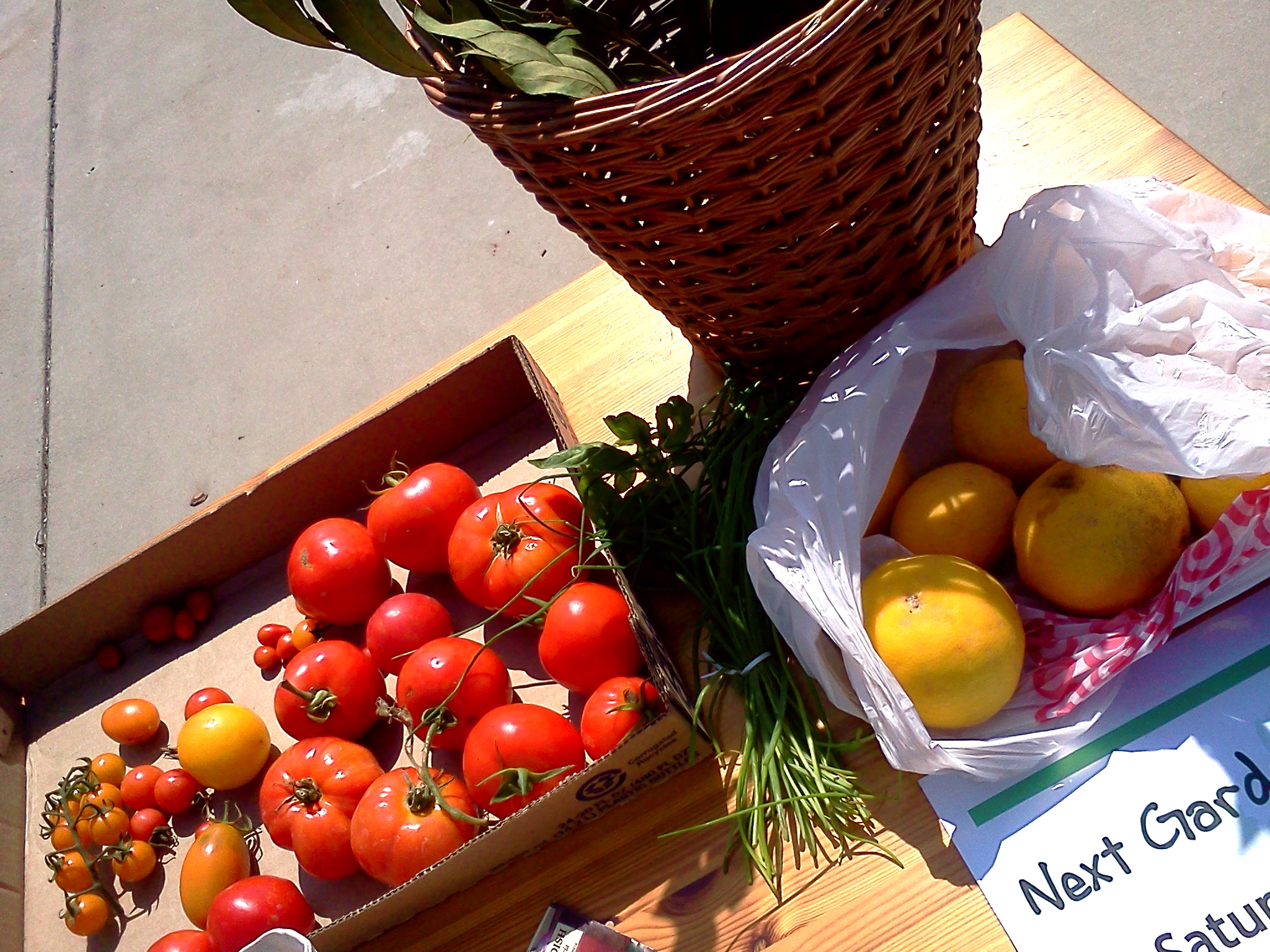 I’ve visited her now in time to catch two of these Garden Exchanges. And I felt bad that I had nothing to contribute (I live in a 2nd floor apartment, and have no yard for gardening**) but– after she distributed some of the extra food to the neighbors who couldn’t make it– at least I could help her out by volunteering to take home some of the extra avocados, lemons, figs, and tomatoes! (Anytime, Jill! Anytime…)