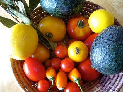 In July, Jill’s neighbors brought over: apples, blackberries, radishes, oranges, zucchini, avocados, lemons, tomatoes, bay leaves, and peaches. And in August: various squashes, figs, basil, apples, citrus fruits, green beans, chili peppers, and many many tomatoes. In September: more tomatoes and avocados, habañero peppers, bay leaves, figs, squash, chives, and lemons.