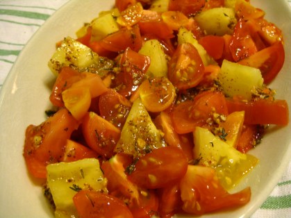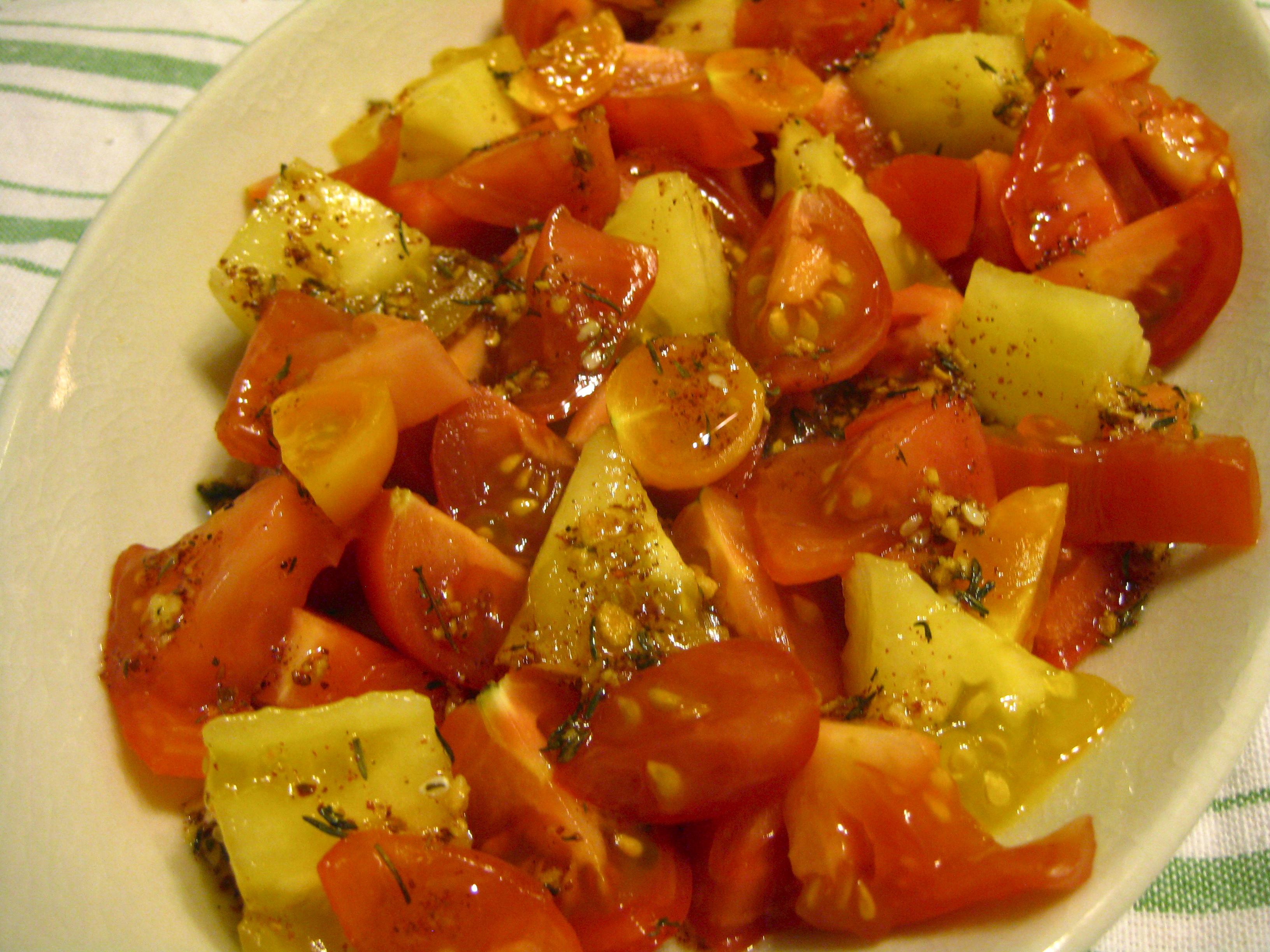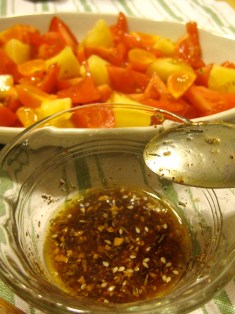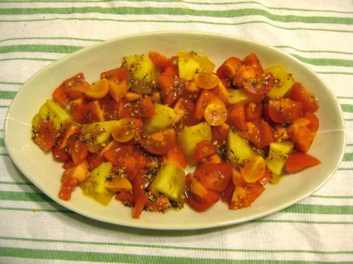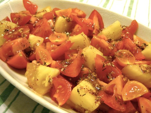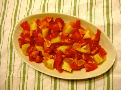 So, what to do with a basket full of fresh ripe tomatoes as the end of the summer nears? I’m still tempted to try out this “naked tomato sauce” recipe from Smitten Kitchen, and I make SK’s slow-roasted tomatoes ALL THE TIME, so I will surely post about those sometime soon here, as well. But these tomatoes tasted too good even to roast for a minute; I could have eaten them right off the plants and called it a meal. Instead, I decided to cut them up and make a quick and easy tomato salad, inspired by my absolute favorite side dish to order in one of my favorite restaurants in Japan: Orange Cafe in Shunan, Yamaguchi prefecture.***