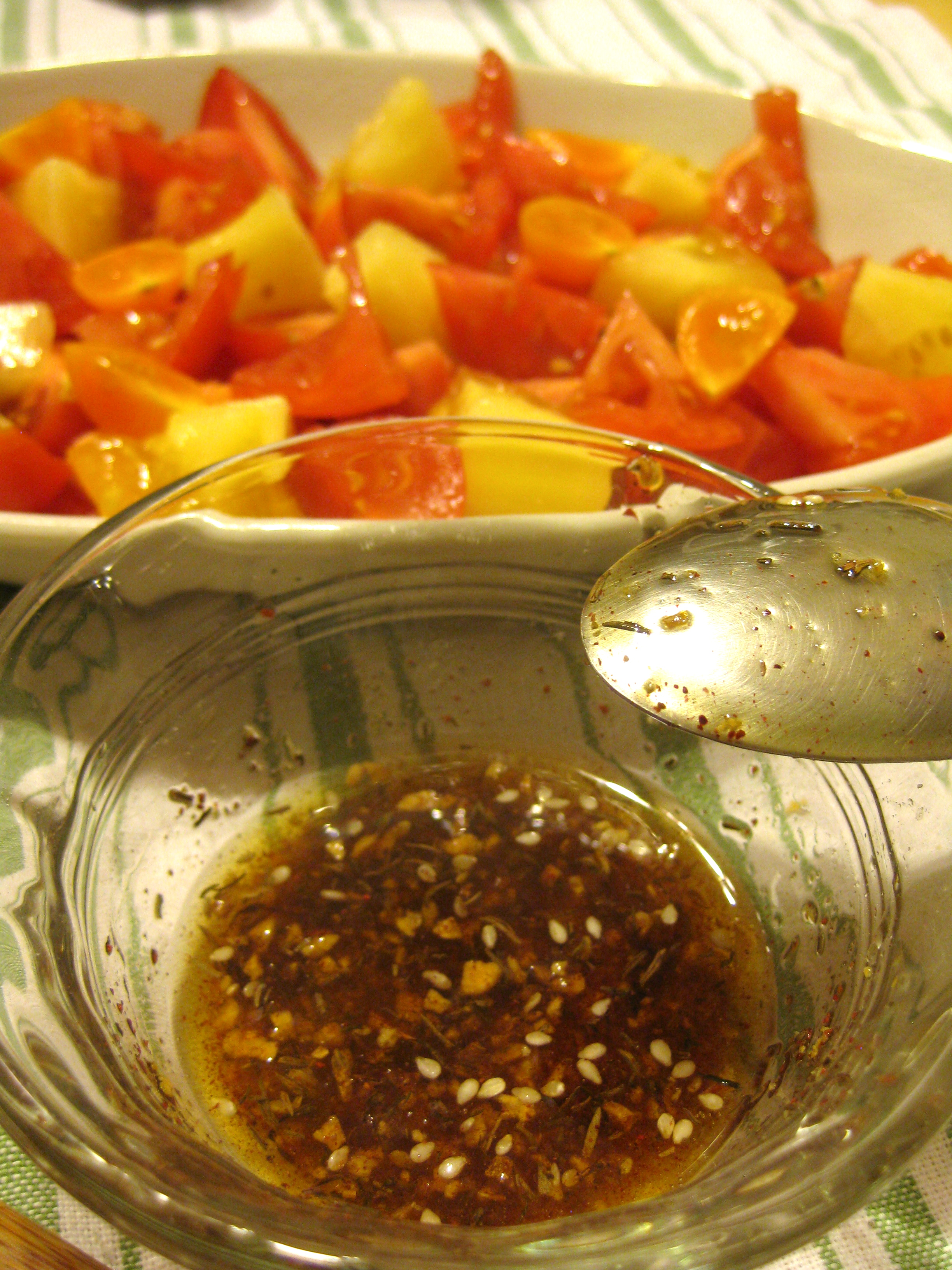 3. Make the dressing: In a small bowl, stir or whisk together olive oil, za’atar, garlic, and salt. If you don’t have za’atar, you can still add some of its ingredients; the sumac is the strongest flavor, but since it tastes a little lemony, you could substitute a small squeeze of lemon or lime juice.