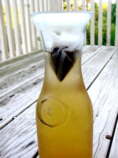 1. Fill a pitcher with water, and add one tea bag for each half gallon of water (1 bag for a small pitcher, 2 for a large one).