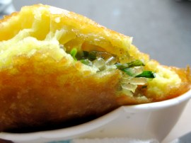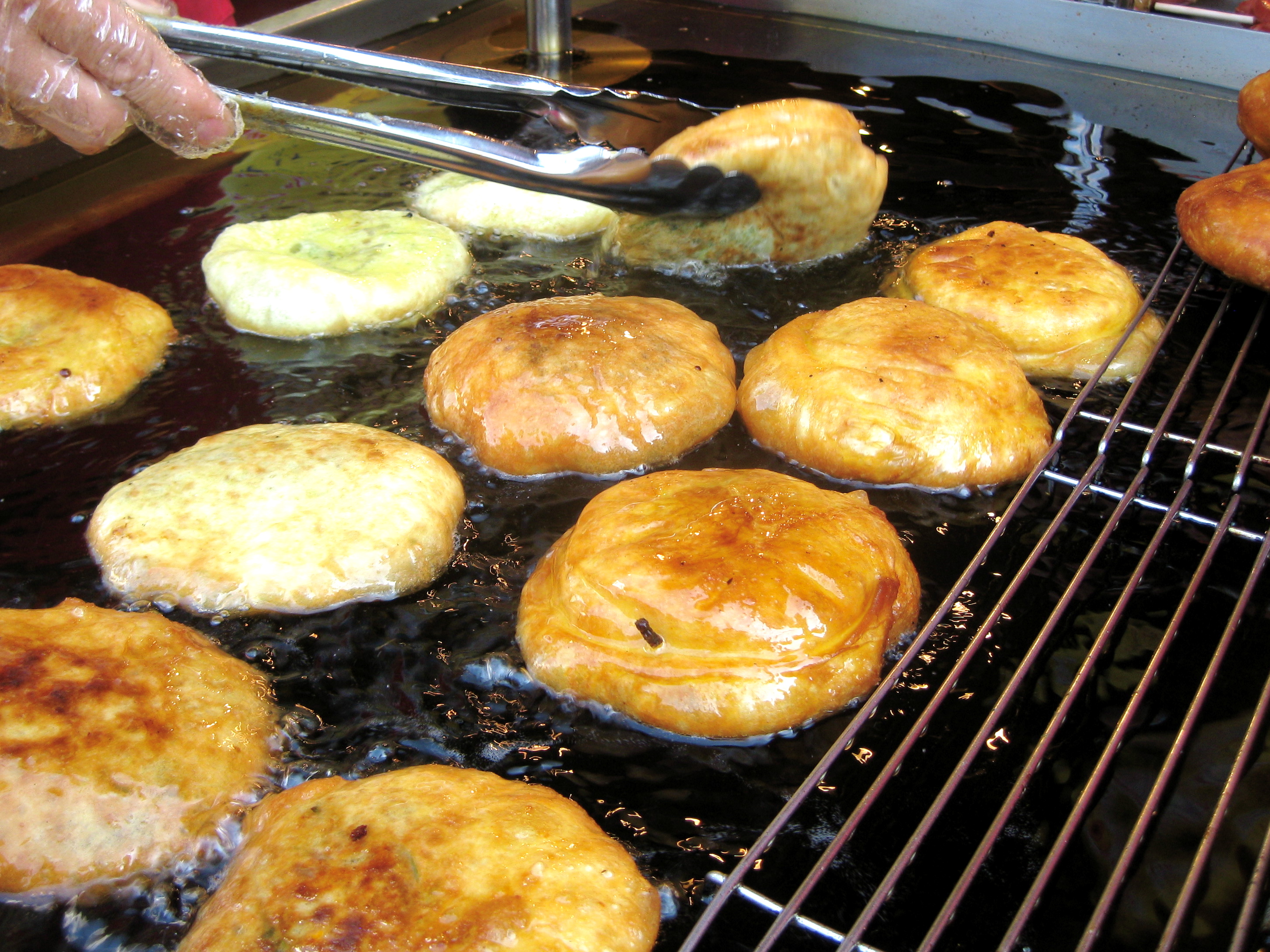 The other version of ho-tteok I came across were deep-fried and filled with japchae! (A vegetable– and sometimes beef– noodle dish made with dangmyon sweet potato starch noodles and sesame oil; I’m planning to post a japchae recipe soon!)