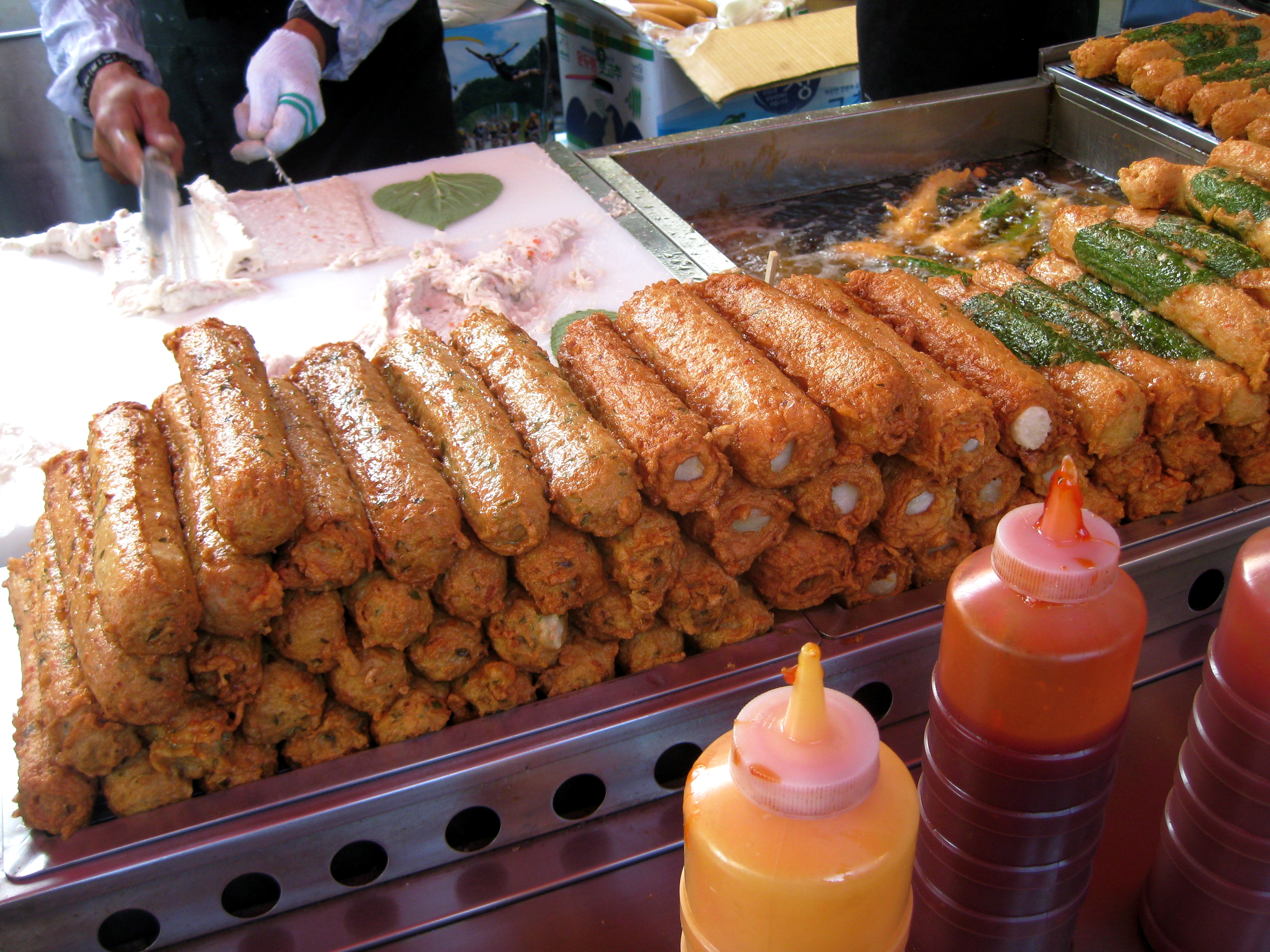 Continuing in the deep-fried category, I saw this 핫바 being prepared: you take a fishcake (or hotdog) then wrap it in more fish paste, then wrap it in a shiso leaf, then deep-fry it on a stick! (Like a version of chikuwa, or oden in Japan, but with spicier variations available and extra chili sauces on hand.) I love these things, but was too full at this point to partake…