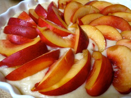 5. Add dry ingredients (step 3) to wet ingredients (step 4), and stir until just combined. Pour batter into the baking dish, then arrange fruit slices on top.