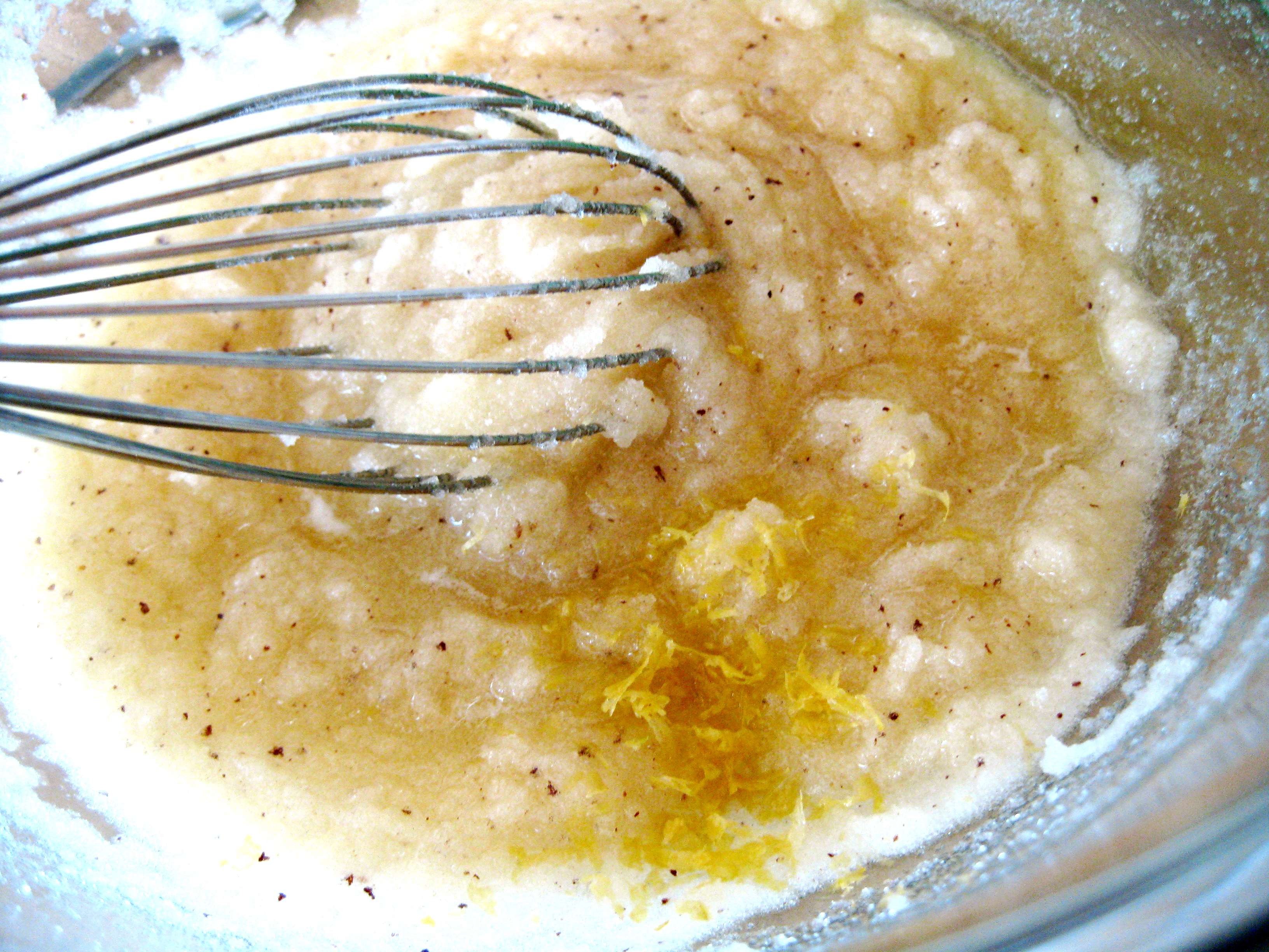 4. In a large bowl, add ½ cup of the browned butter to the sugar (save the remaining ¼ cup of brown butter for the topping). Then whisk in the eggs, one at a time, and stir in the lemon zest, vanilla, and buttermilk.