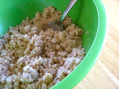 6. Make the topping in a medium bowl, by mixing all of the dry topping ingredients together, then stirring in the remaining brown butter until it’s mixed well and begins to get crumbly. Sprinkle topping over the cake, and bake for 40 minutes, until top is nicely browned.