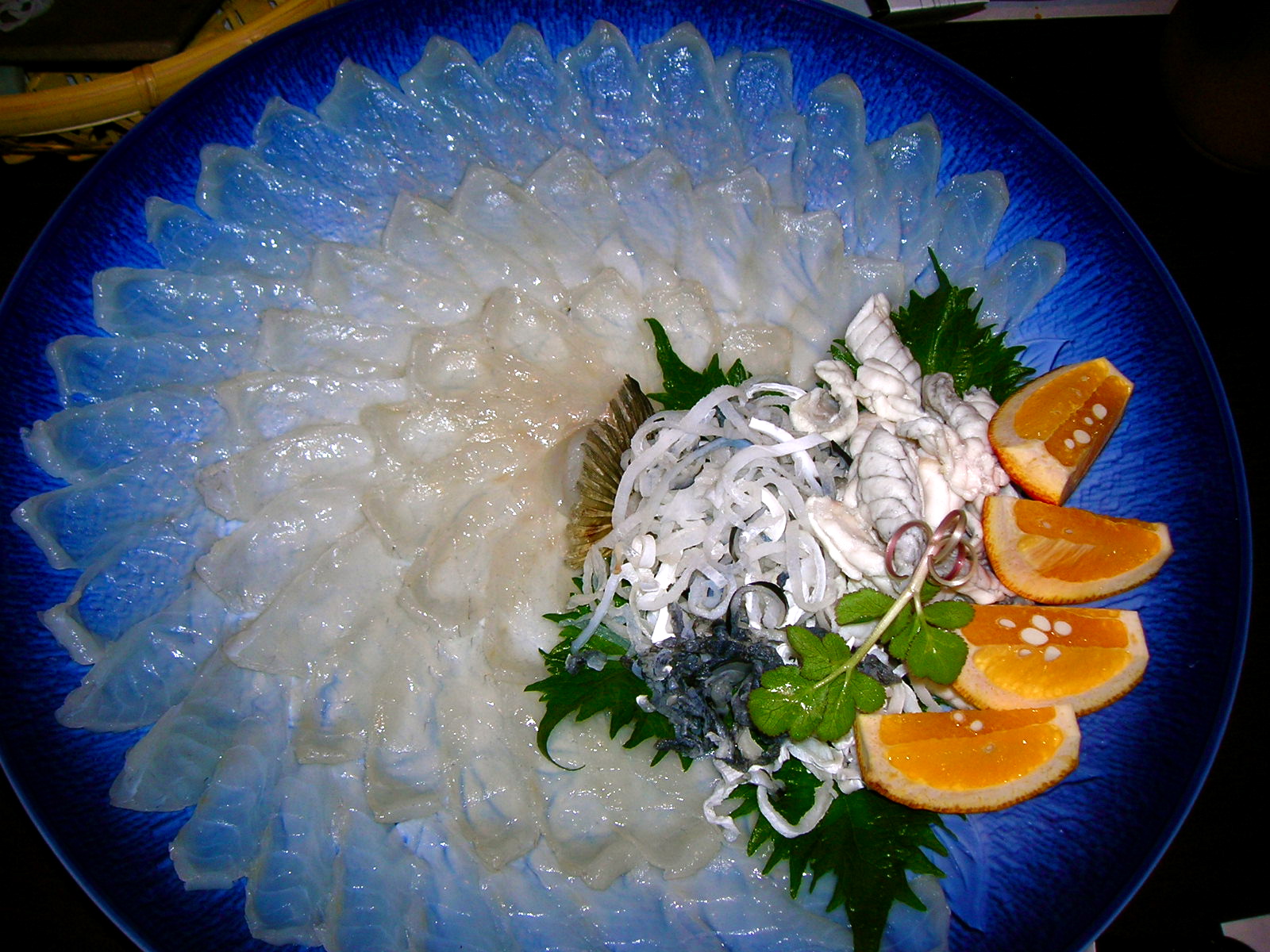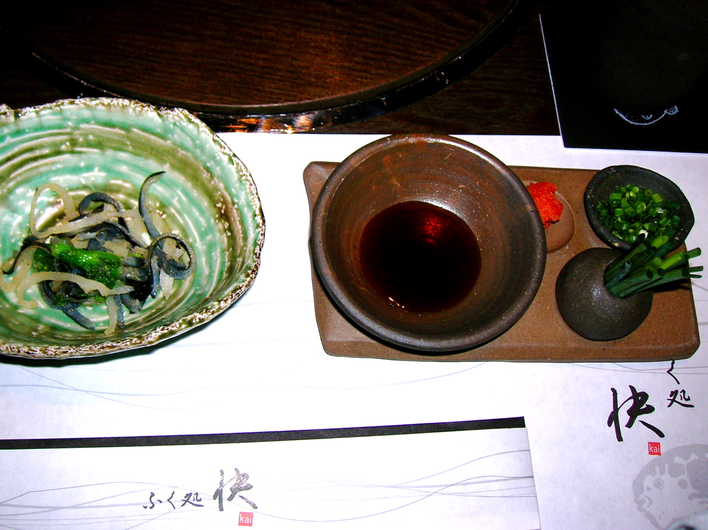 Some fugu sashimi I ate on a previous trip to Japan; The fugu skin as an appetizer, and accompaniments for the sashimi (you place some scallions on a slice of sashimi, roll it up with your chopsticks, then dab it into the dipping sauce.)