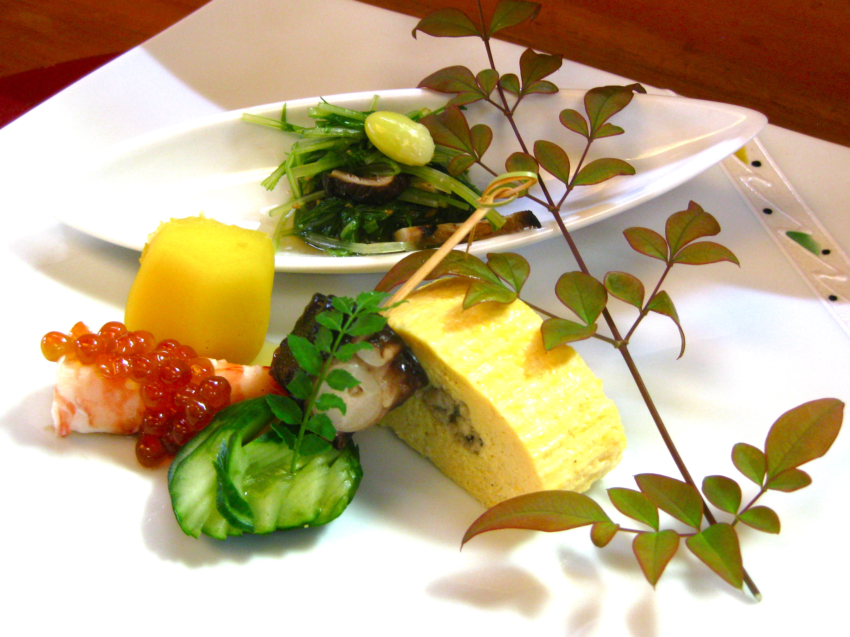 First course. (Including shrimp, pickles, salmon roe, and a Japanese omelette stuffed with eel.)