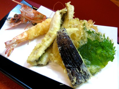 Fifth course: Shrimp, eel, eggplant, and shiso tempura (with a bowl of sea salt for dipping).