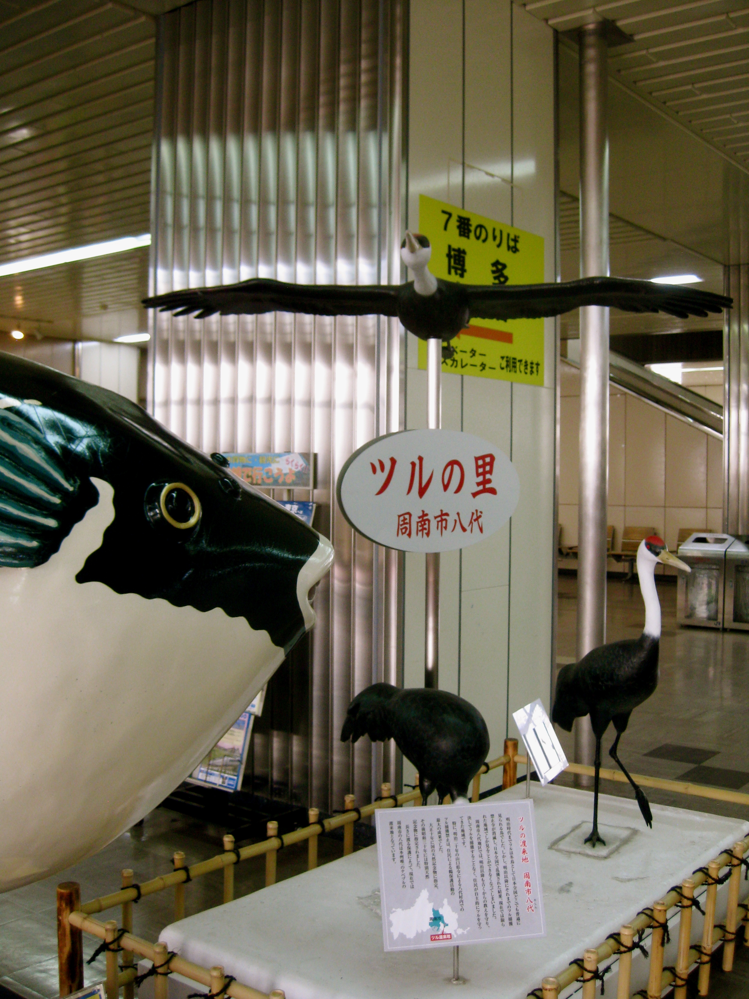 A giant blowfish in Tokuyama station (the symbol of Tokuyama) next to some cranes (the symbol of Tokuyama’s amalgamated new city, Shunan.); A tourism billboard for Shunan City, featuring a veterinarian helping a blowfish.