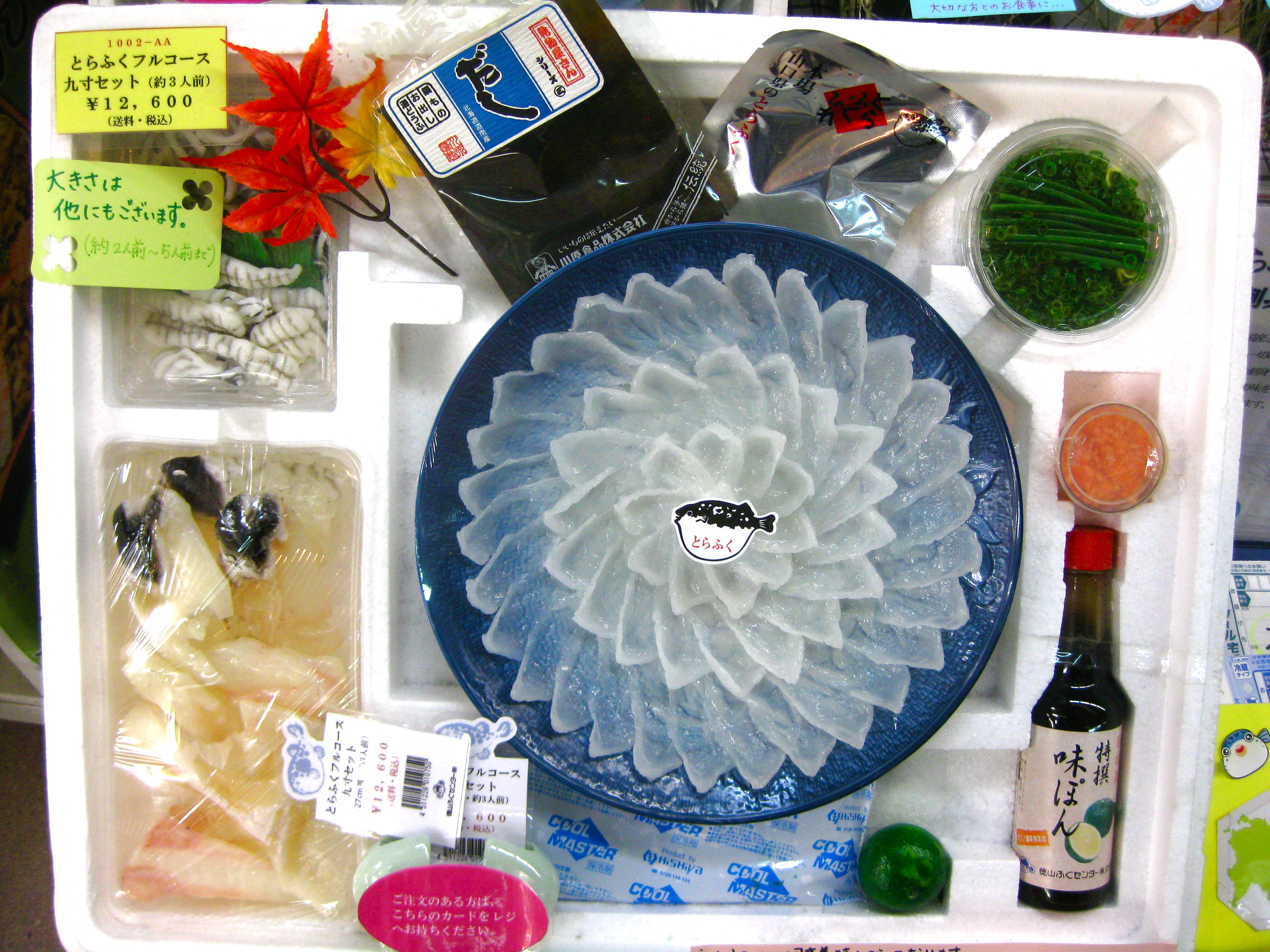 Yamaguchi Prefecture (where I used to live) is famous for fugu, or blowfish. I had some time to spare in Tokuyama train station, and noticed that they even sell these do-it-yourself fugu sashimi kits.