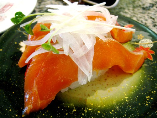 Salmon with onions and a Negitoro (fatty tuna mush with scallions) in the background; One of the few rolls (maki rather than nigiri) on the menu: fried shrimp with lettuce and mayonnaise.