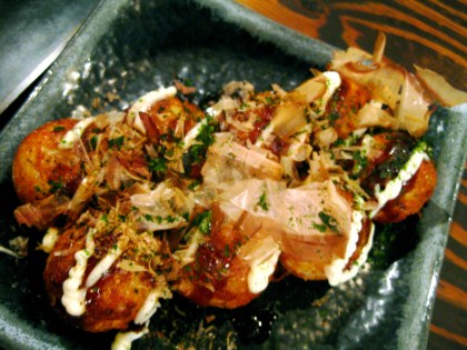 A different night in Tokyo, I got to check one more must-eat off the list: Takoyaki. Or fried balls of dough, each stuffed with a bite-sized bit of octopus. Often topped with mayonnaise and bonito shavings.