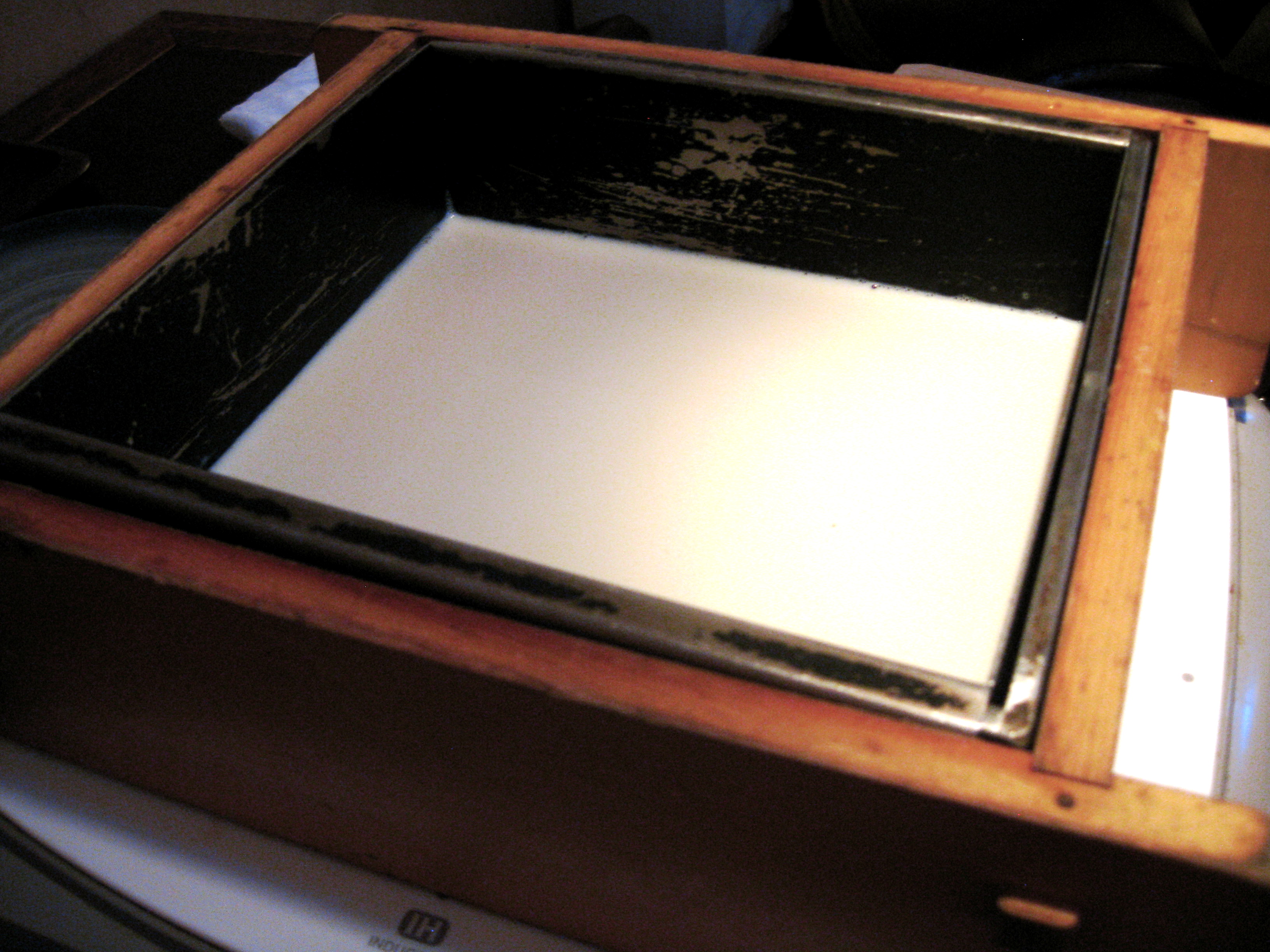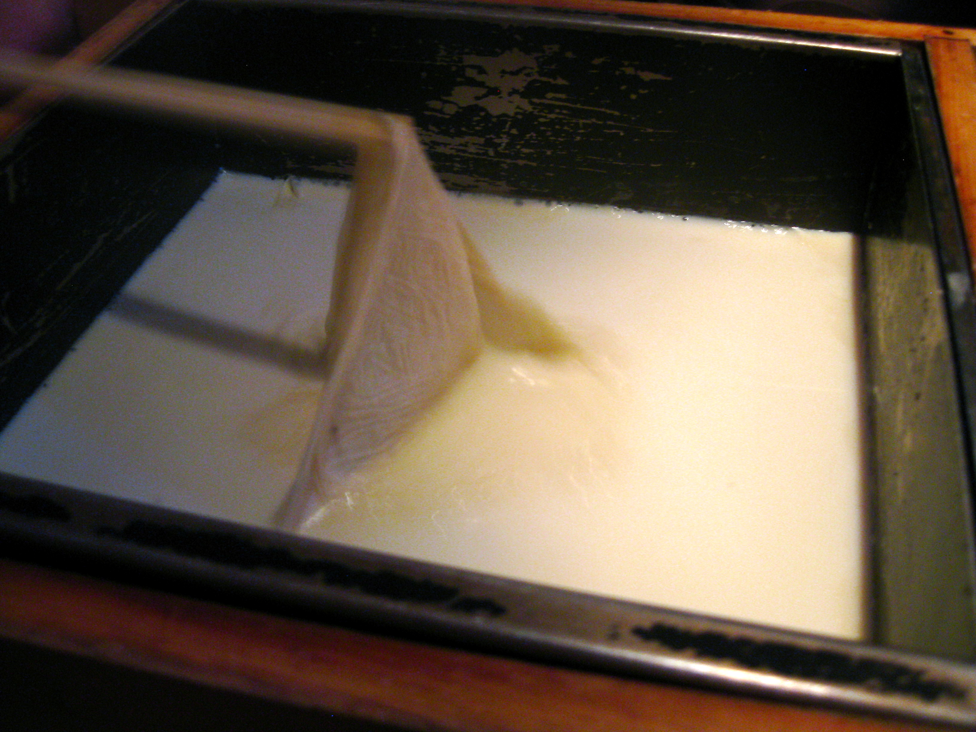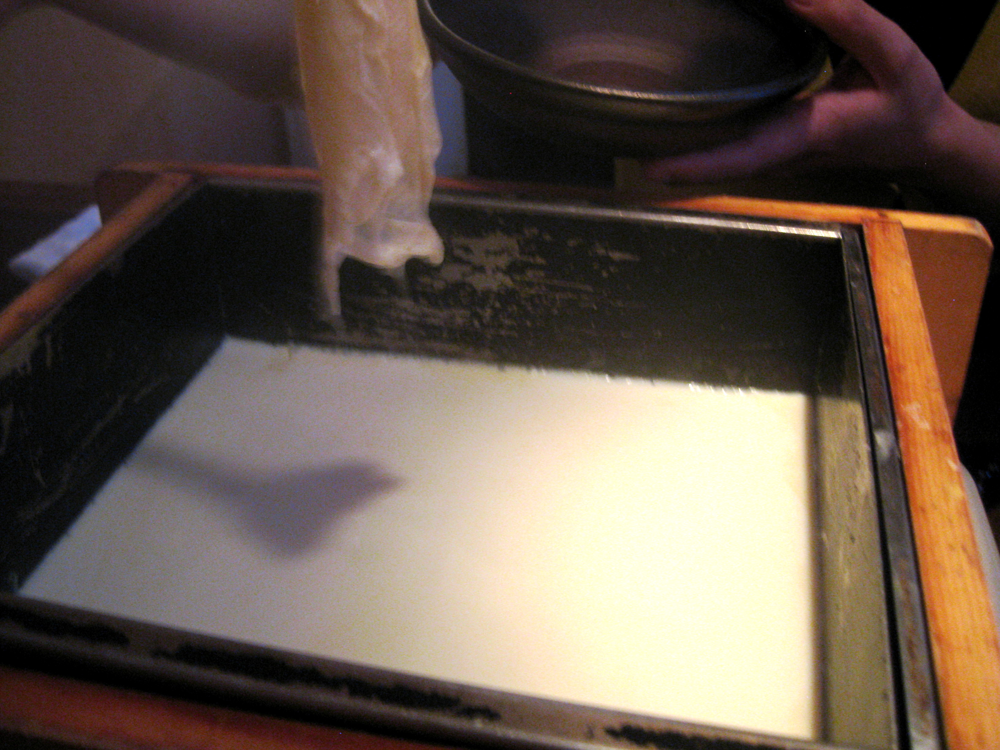 The first time I had yuba, layers and layers of the stuff were wrapped and rolled around each other into soft tofu-like dumplings, so I didn’t get to see the soy milk work its magic. This time, we had do-it-yourself yuba, simmering in a metal-lined wooden box, set up on an electric hot plate on our table. The box started out with about a centimeter of soy milk in it: enough for about seven sheets of yuba to form, one at a time.