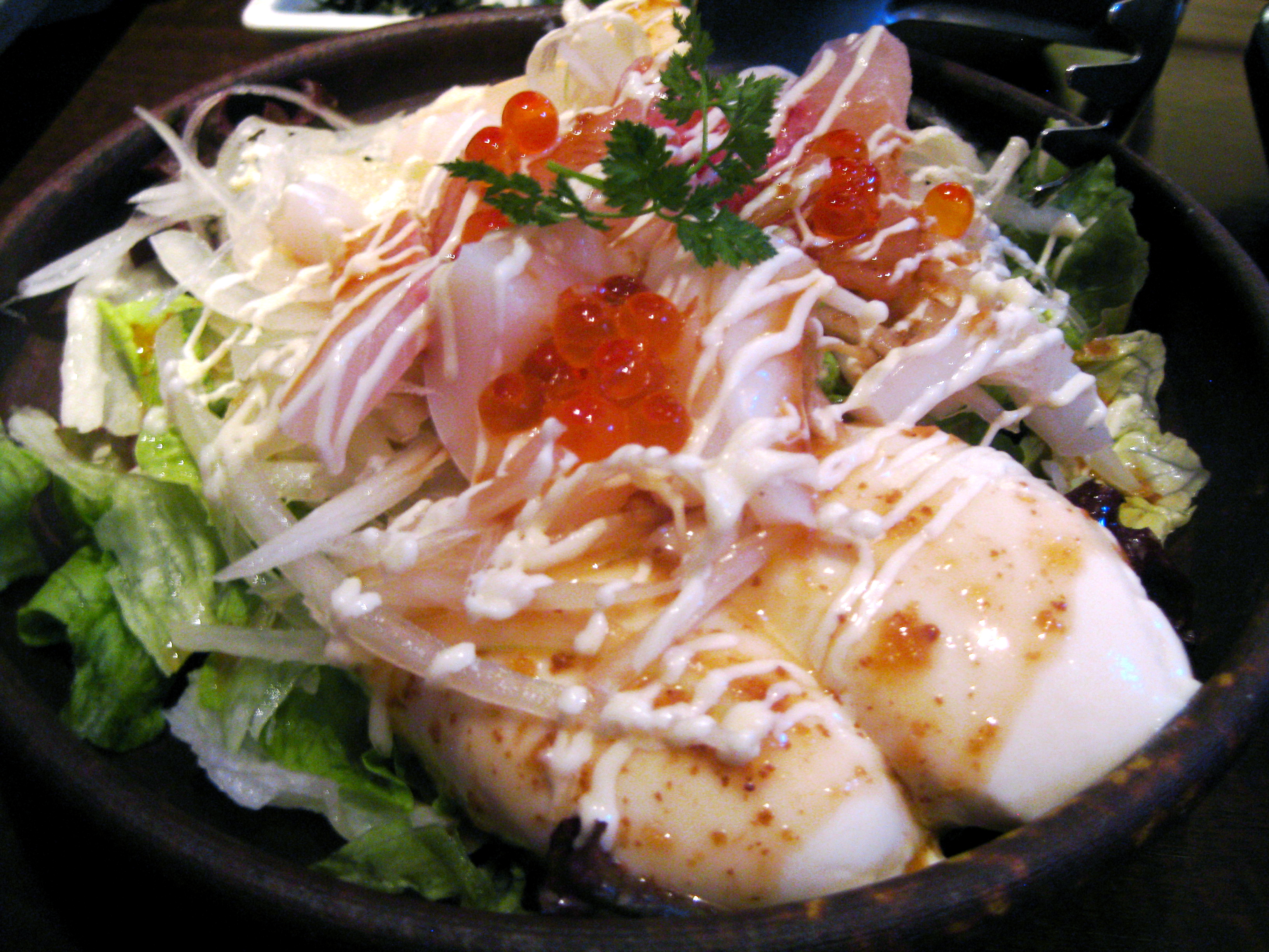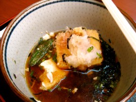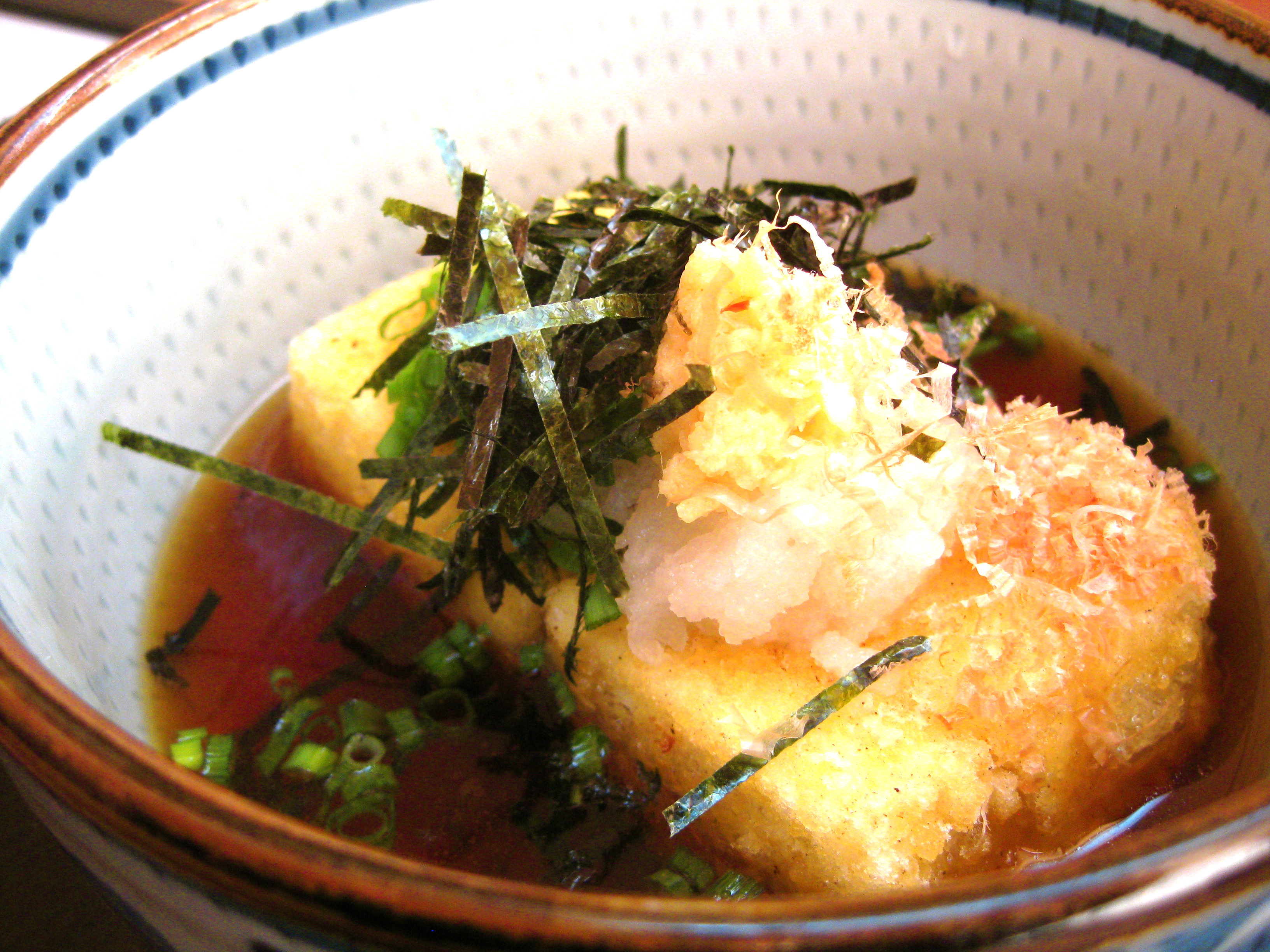 And my favorite: Agedashi-doufu. Deep-fried tofu in a tentsuyu broth, topped with scallions, ginger, daikon, bonito shavings, and seaweed.