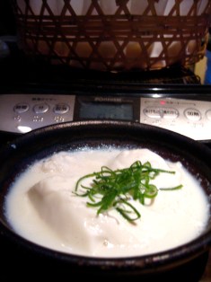 And the happy result of neglecting the temperature buttons on our simmering basket of yudofu (while clearly very preoccupied with the yuba): Bonus yuba! Slightly messier this time.