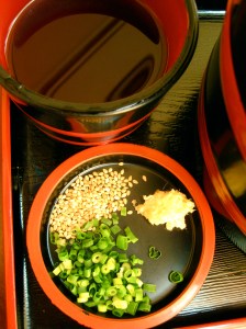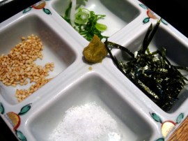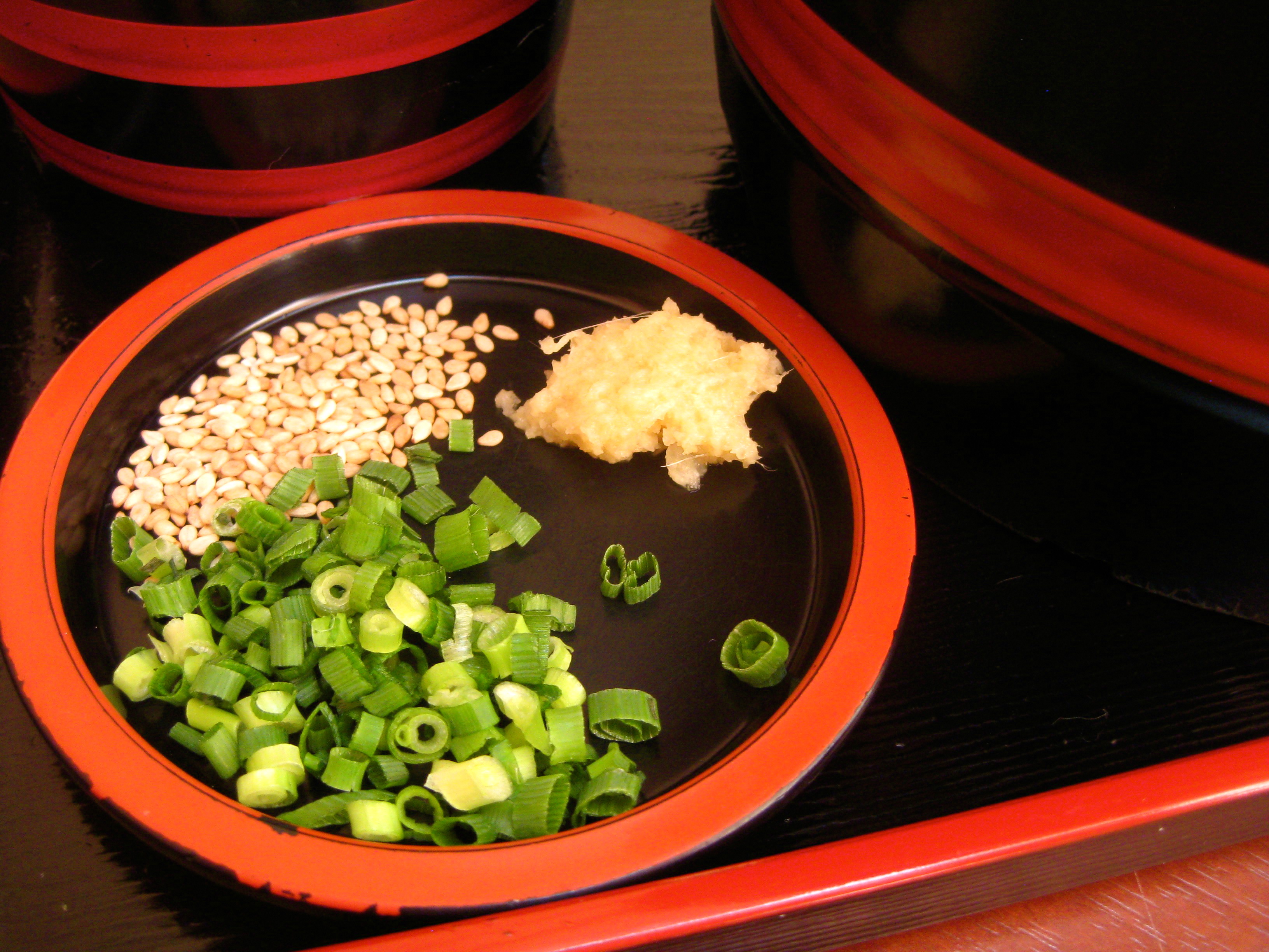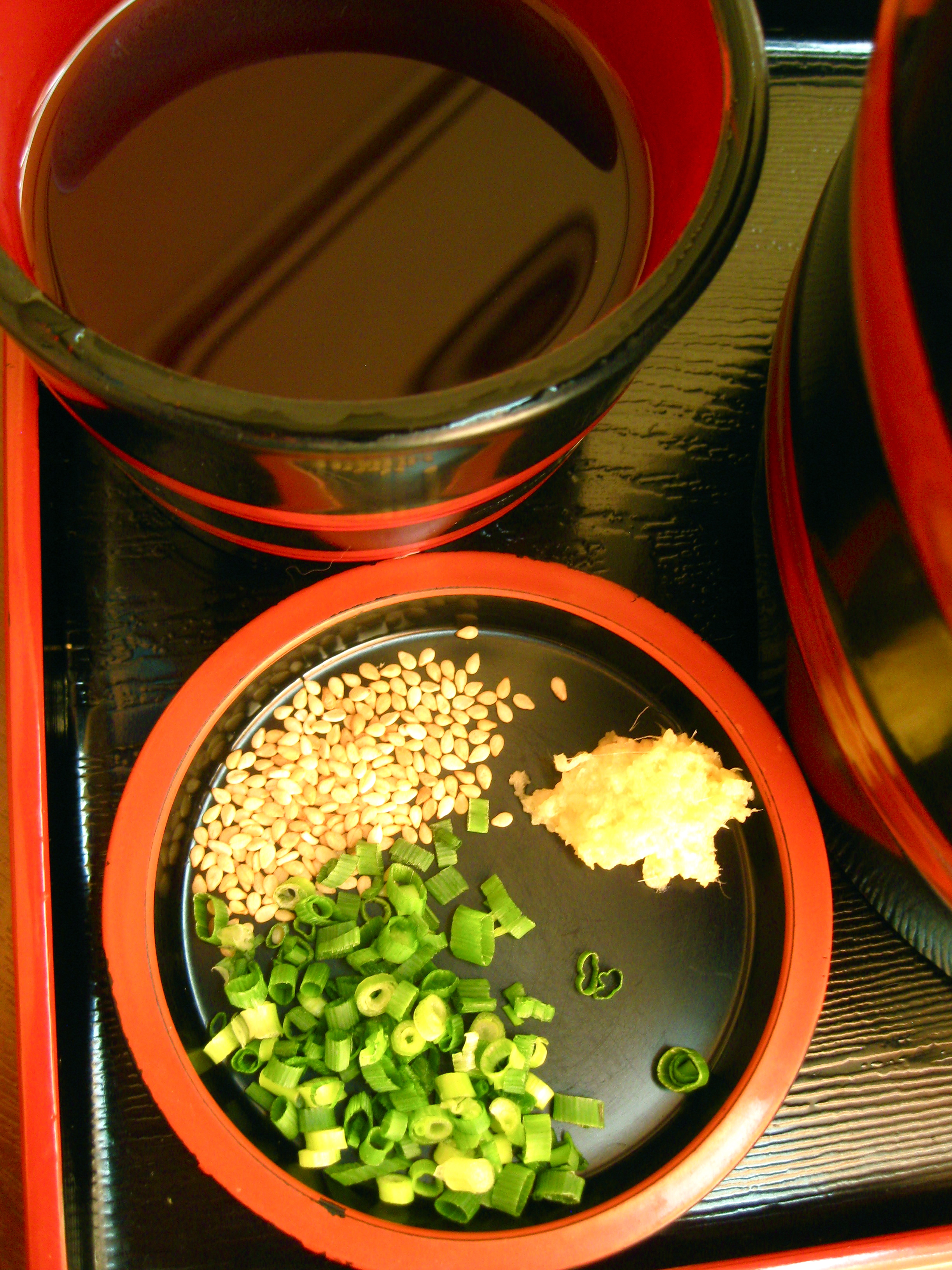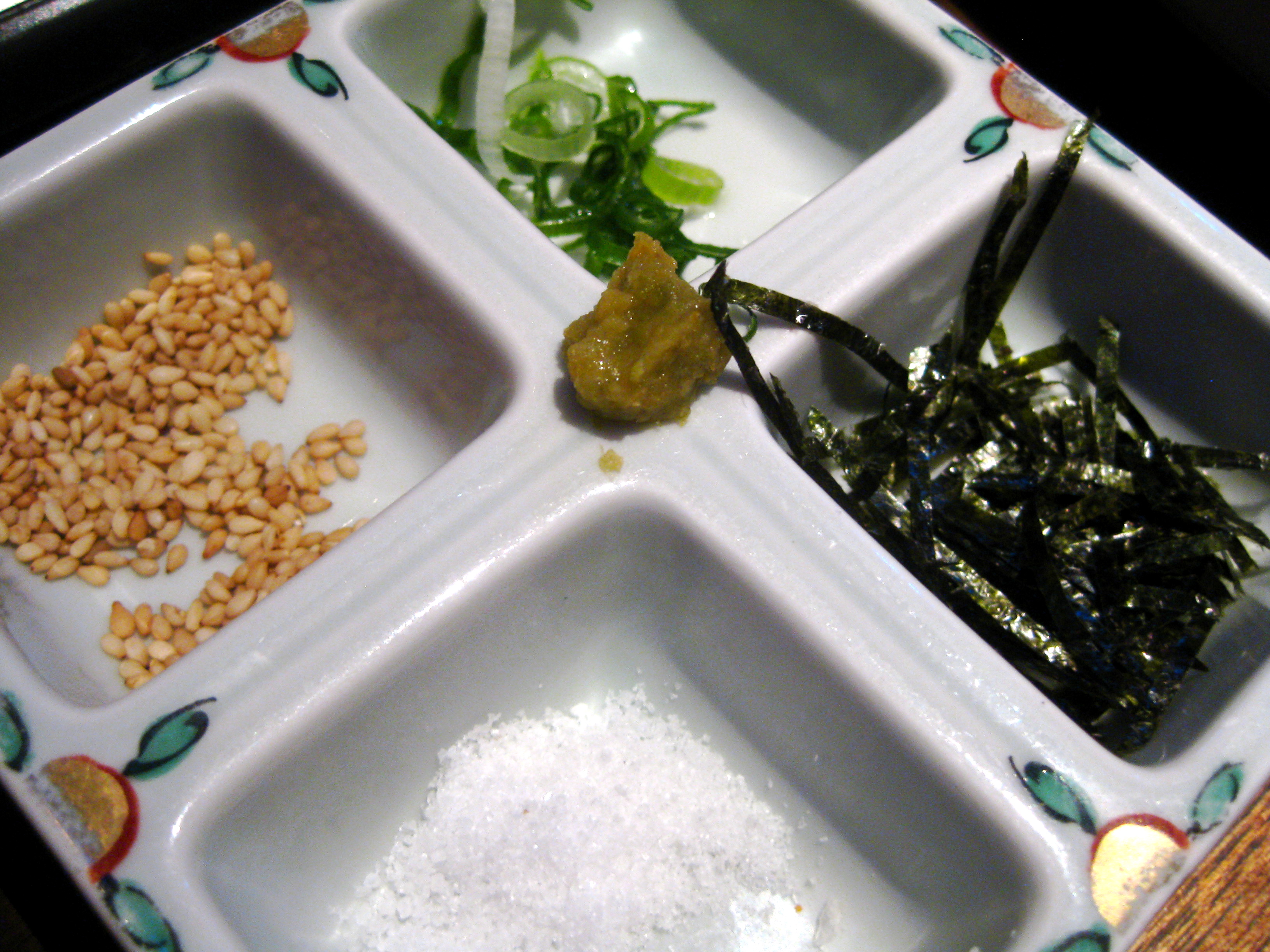 All the trimmings: sesame seeds, scallions, seaweed, salt, and yuzukoshou.