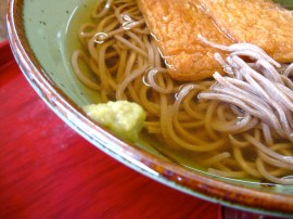 Hand-made soba noodles are the meibutsu of a small city called Izumo in rural western Japan. I didn’t make it back to Izumo this trip, but I still enjoyed a delicious bowl of kitsune soba (with sweetened tofu) in Kyoto. It even came with a dab of fresh-grated wasabi root (not wasabi from a tube!) on the side: so much more pleasant and less harsh than the preservative-laden wasabi, but still very pungent.