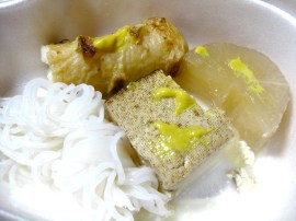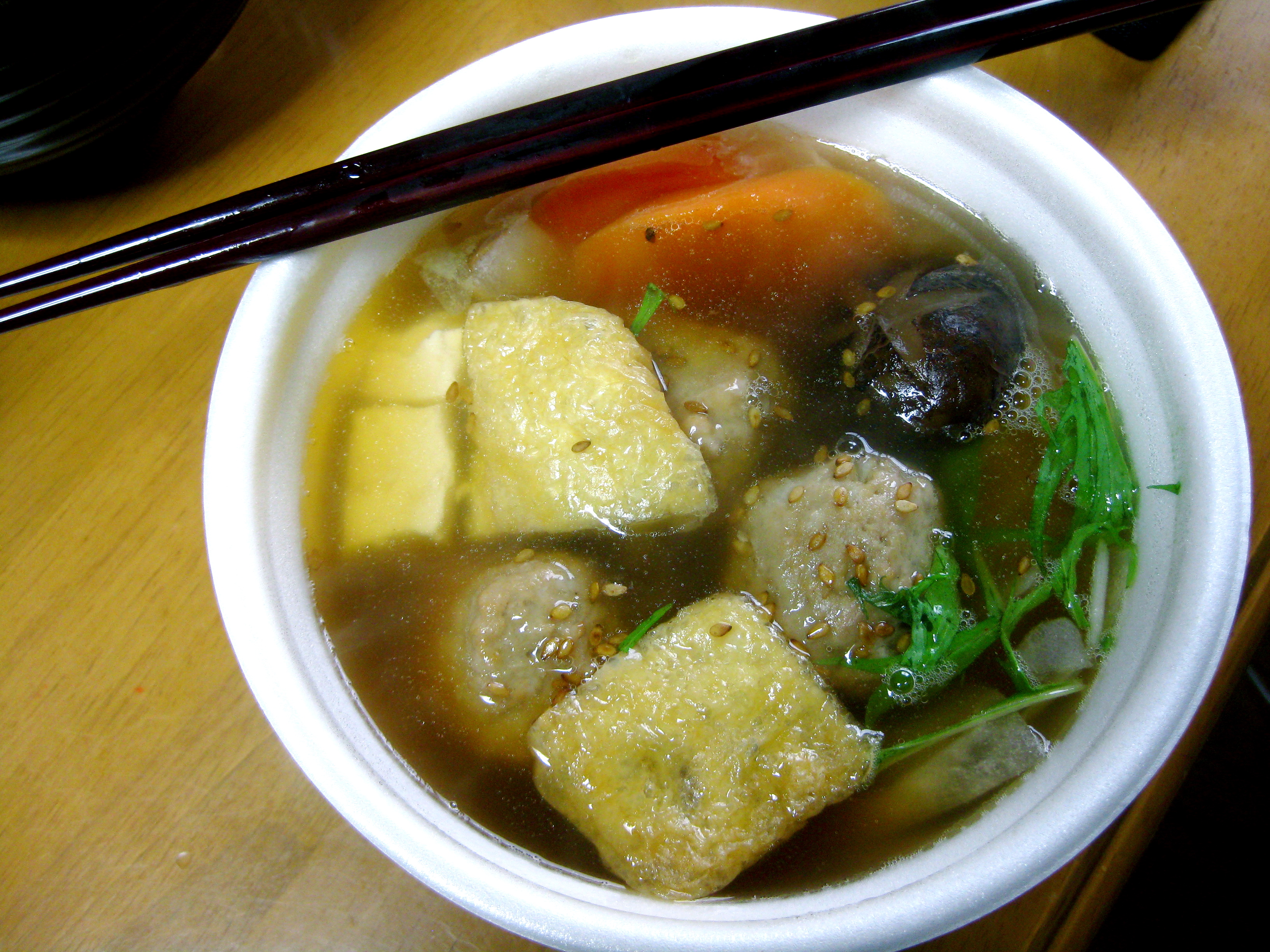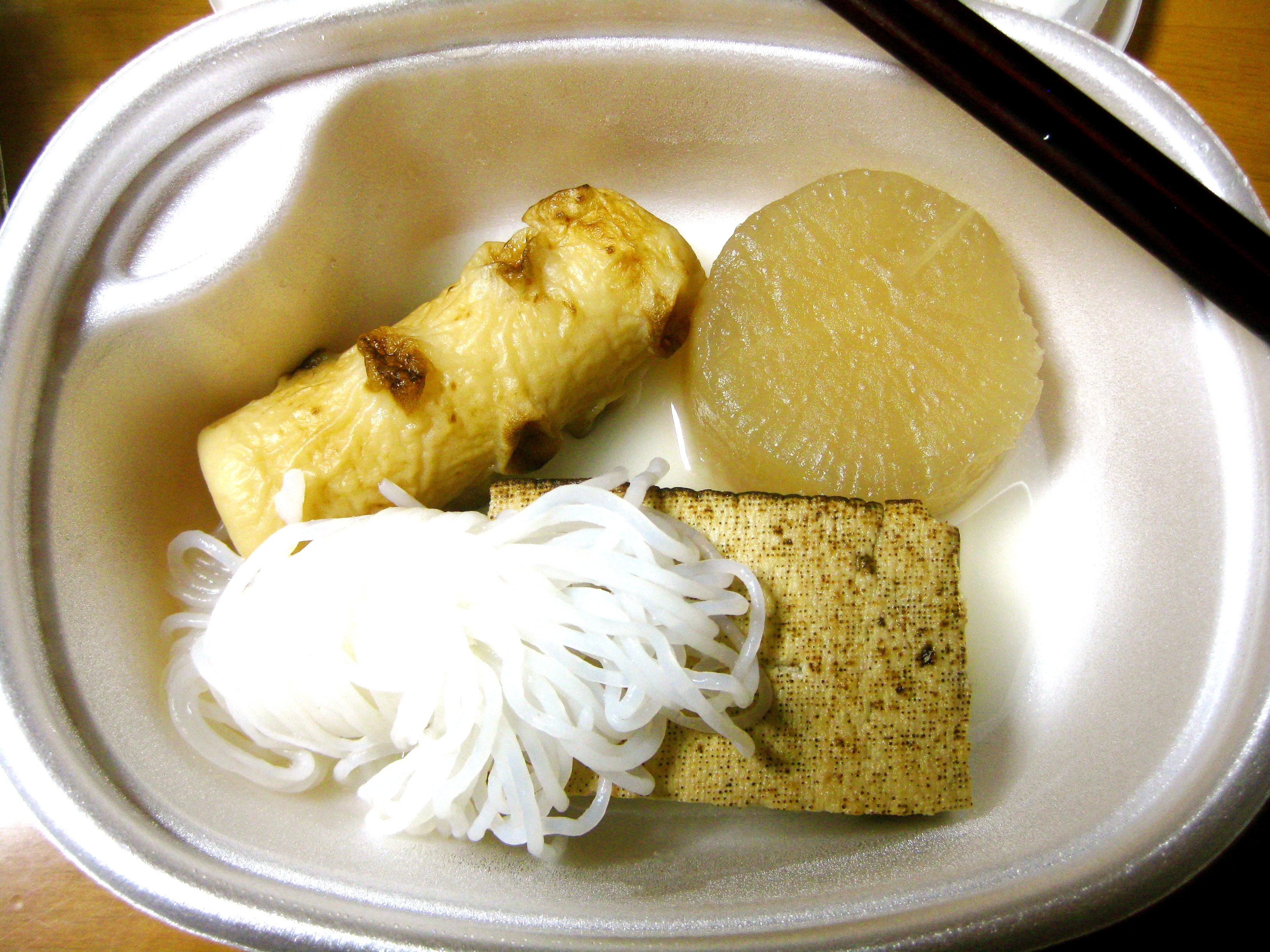 Grilled tofu in convenience store oden (plus konnyaku noodles, chikuwa fish cake, and daikon radish); With spicy mustard.