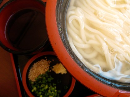 Udon comes served up in countless styles: you can order a bowl of udon in a curry broth (karee udon), or in a hot soup topped with sweetened tofu (kitsune udon), or an egg yolk (tsukimi udon), or tempura; or outside of a soup, you can order stir-fried yaki-udon, cold bukkake udon loaded up with toppings, or chilled zaru-udon strained on a bamboo colander with a dipping sauce on the side.