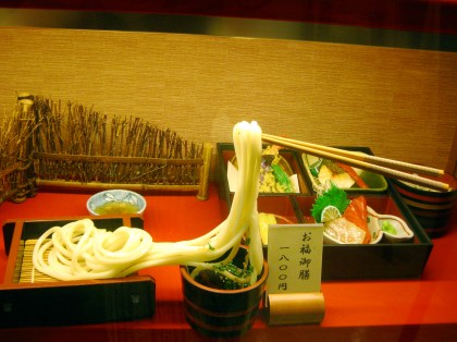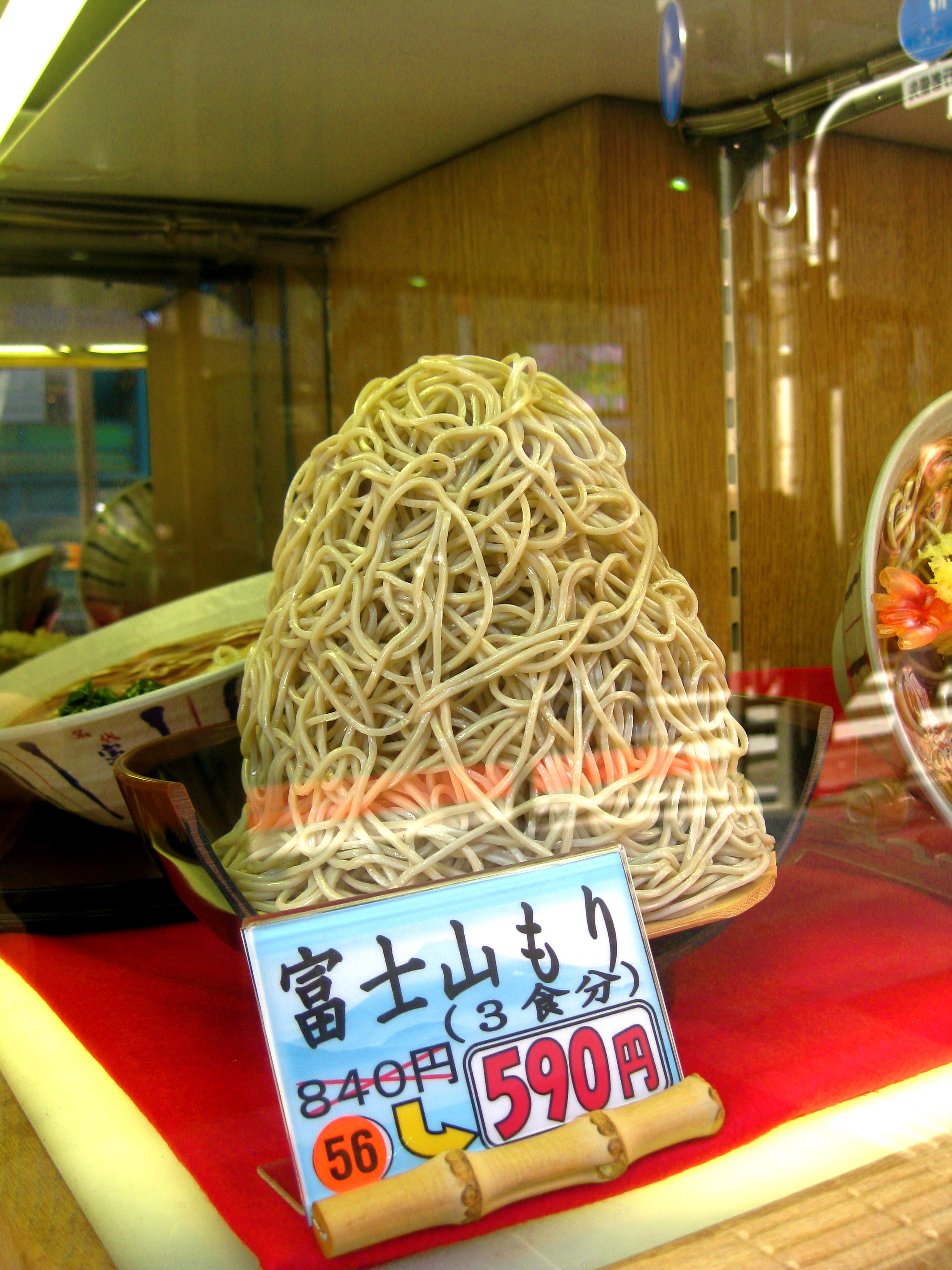 A plastic “Mt. Fuji Pile” of soba noodles in a display window, Tokyo.