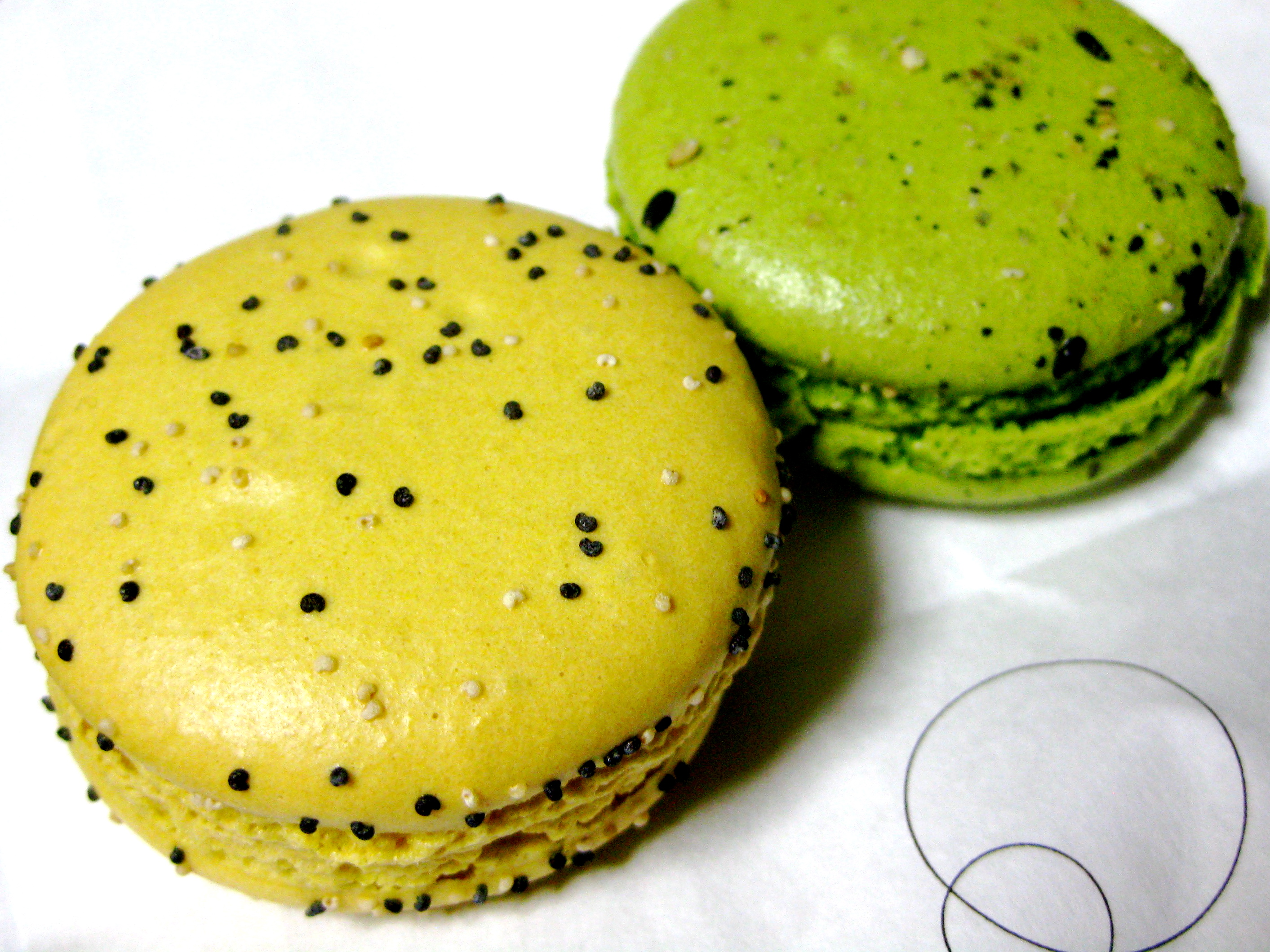 Yuzu- and green tea-flavored macarons, from a French bakery in Kyoto.