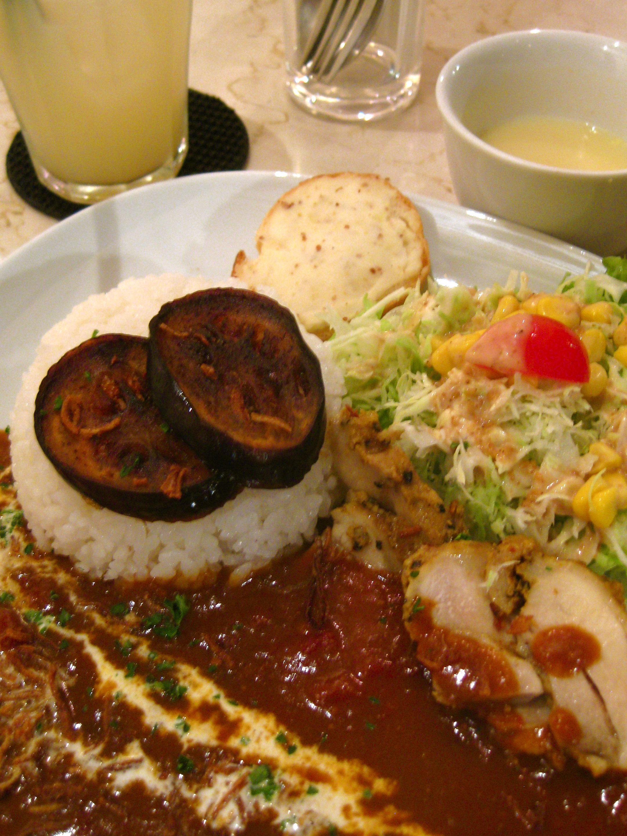 Japanese curry-style Tandoori Chicken curry (and cabbage + corn salad) at a cafe in Okayama.