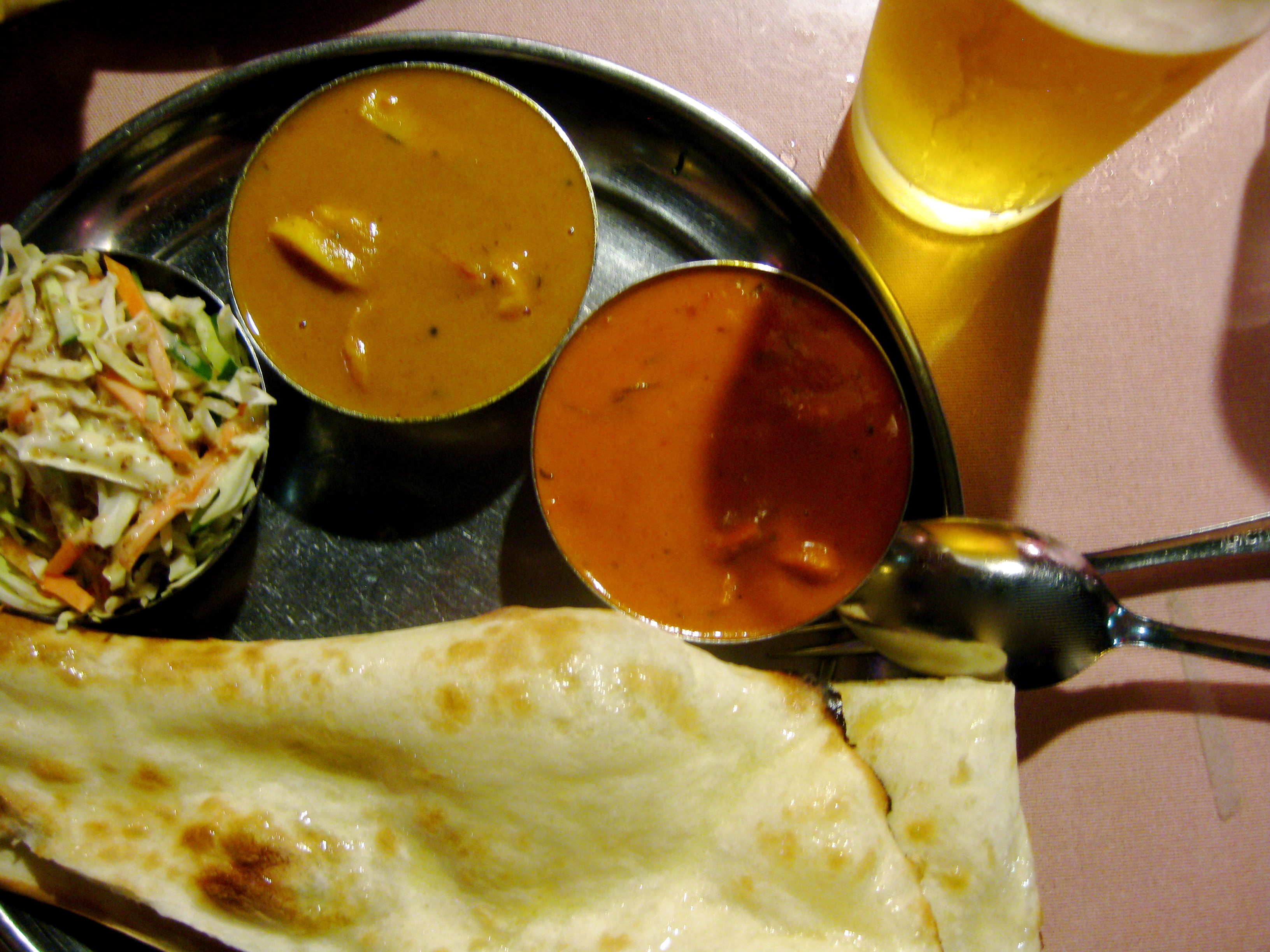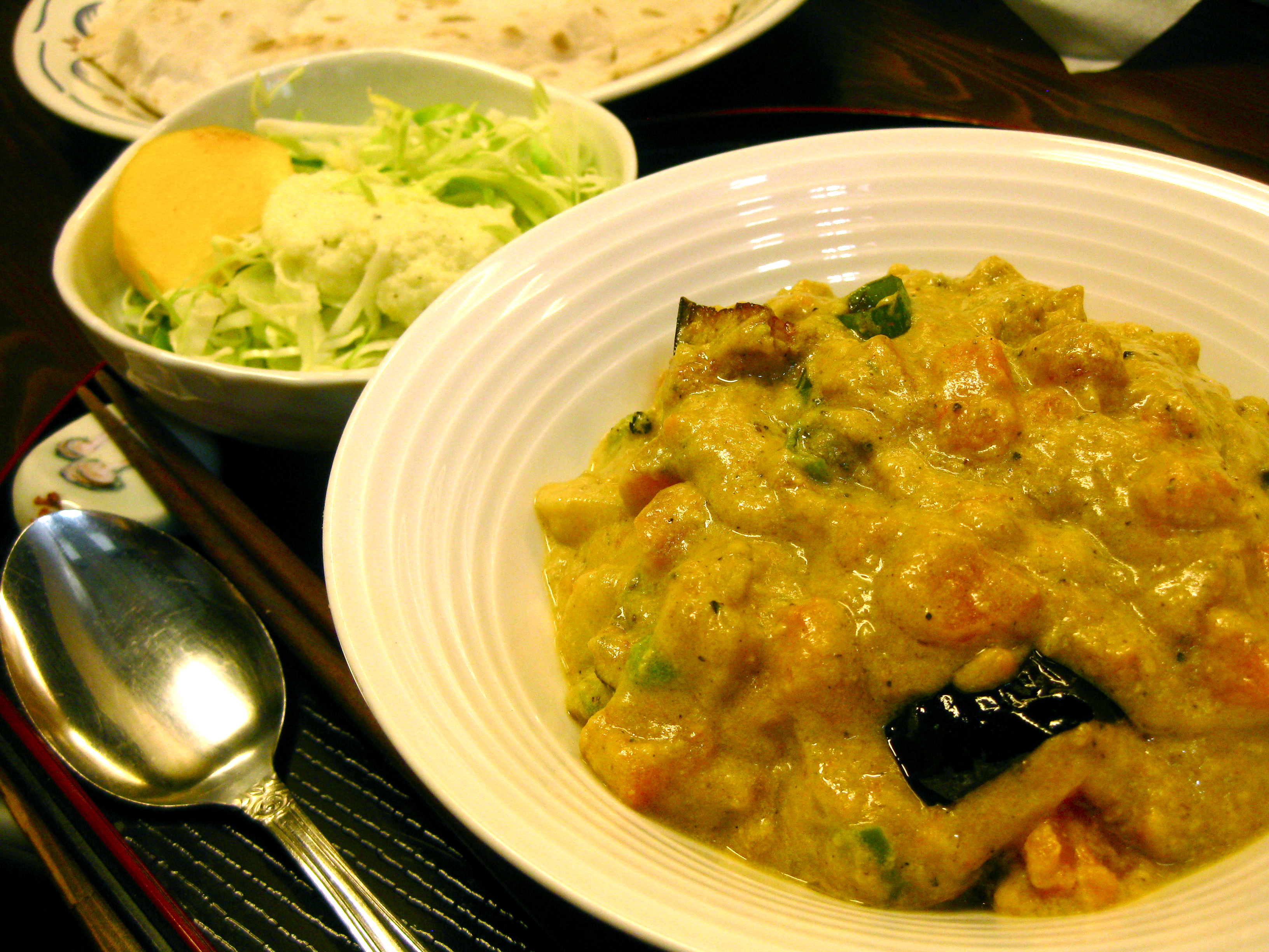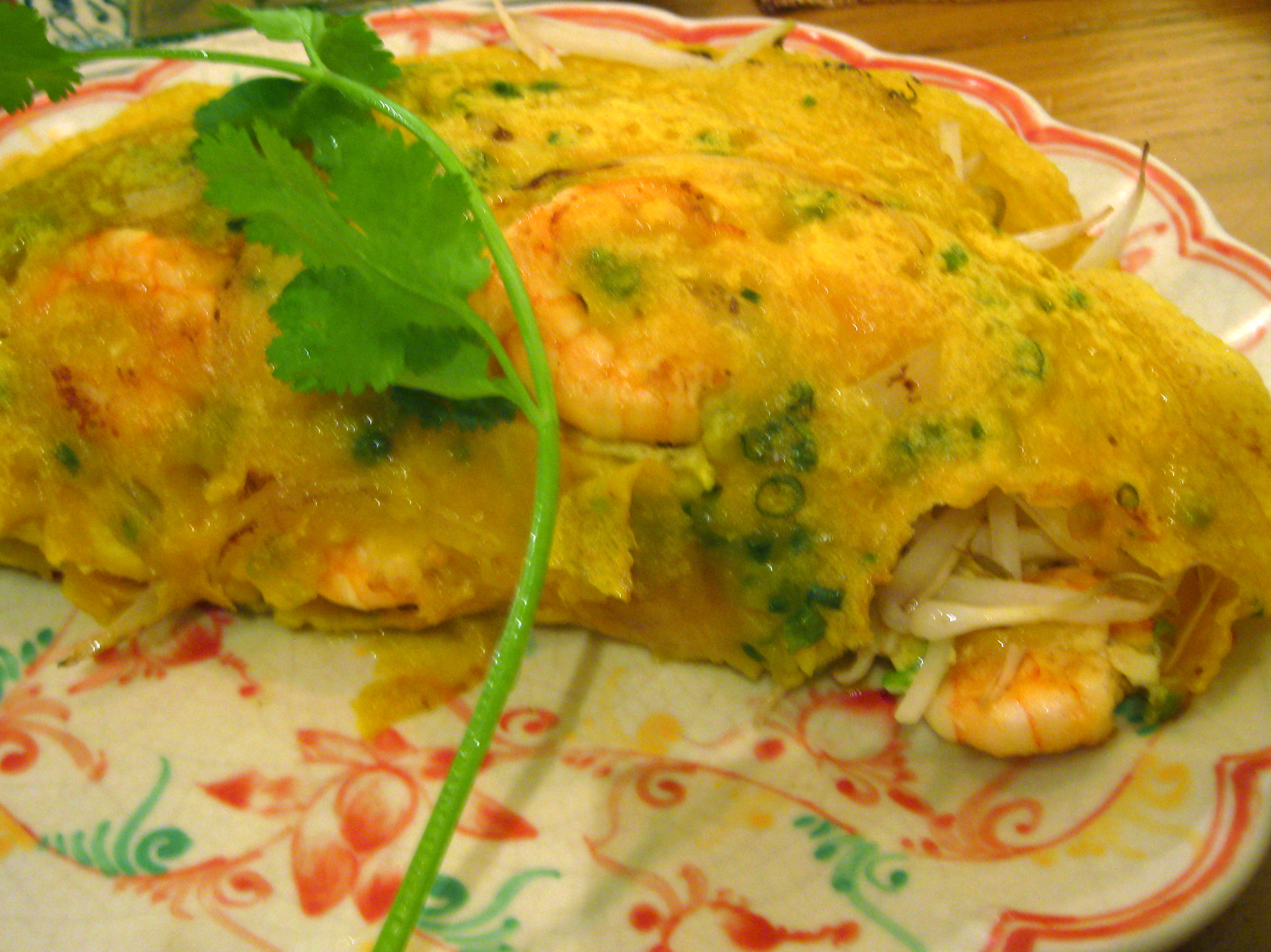 Indian navratan korma curry (and cabbage salad), near Kyoto University; Vietnamese shrimp omelette, in Kyoto.