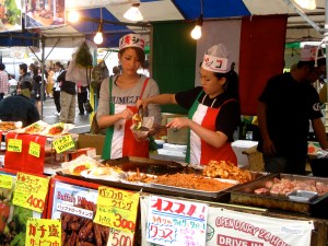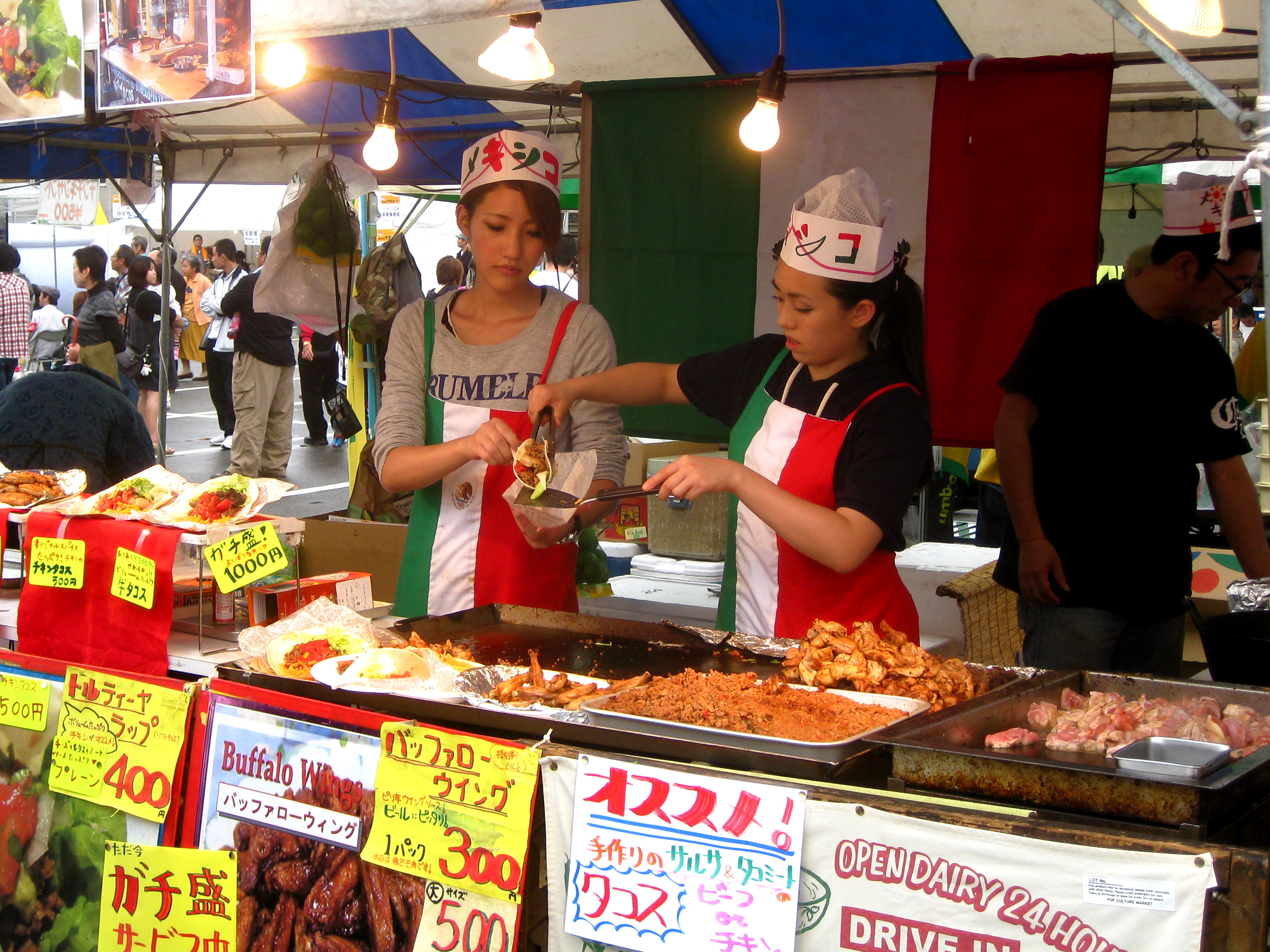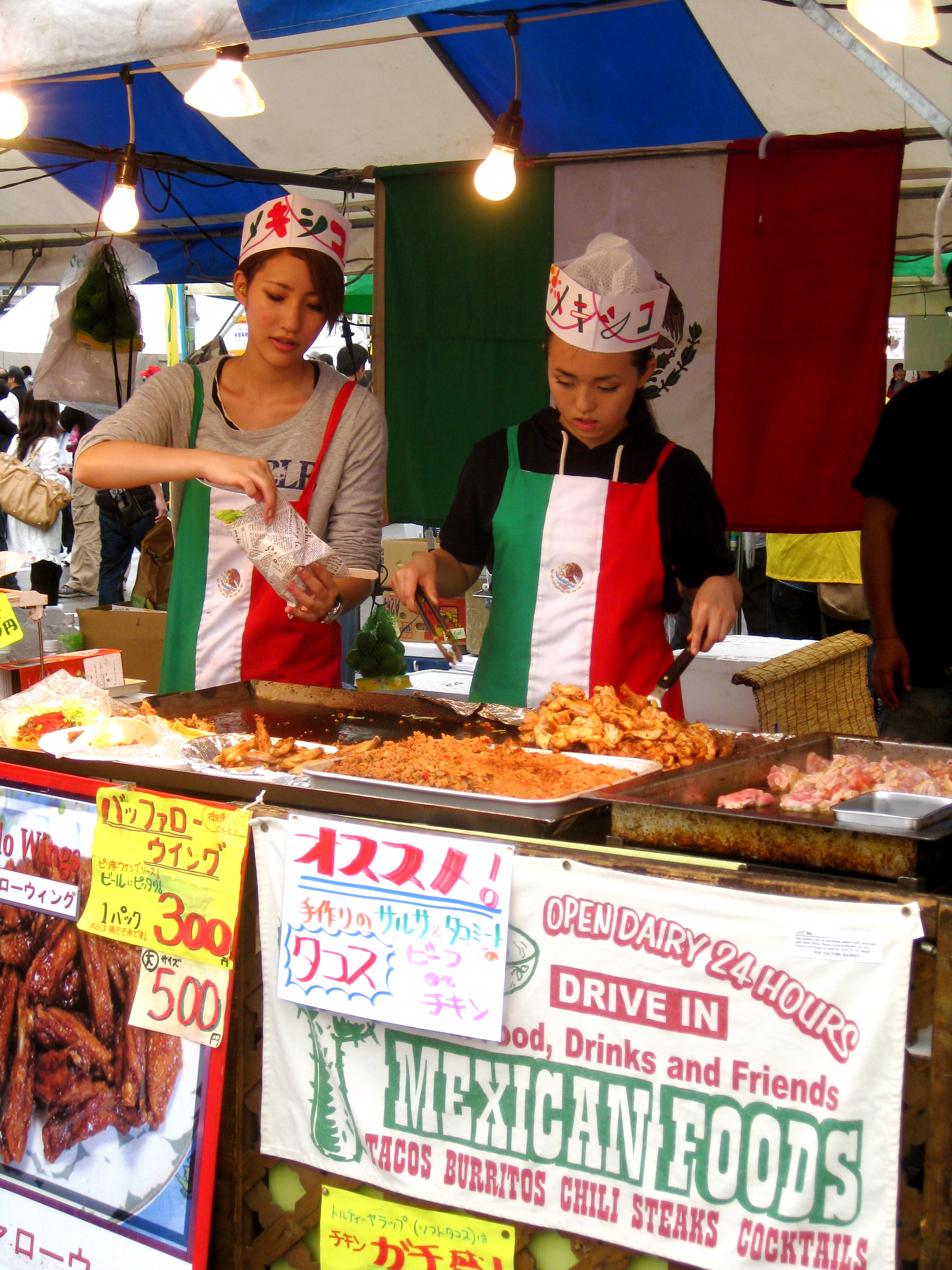 Mexican food stand selling tacos and buffalo wings, among the international food stands at the Ube city festival in Yamaguchi prefecture.