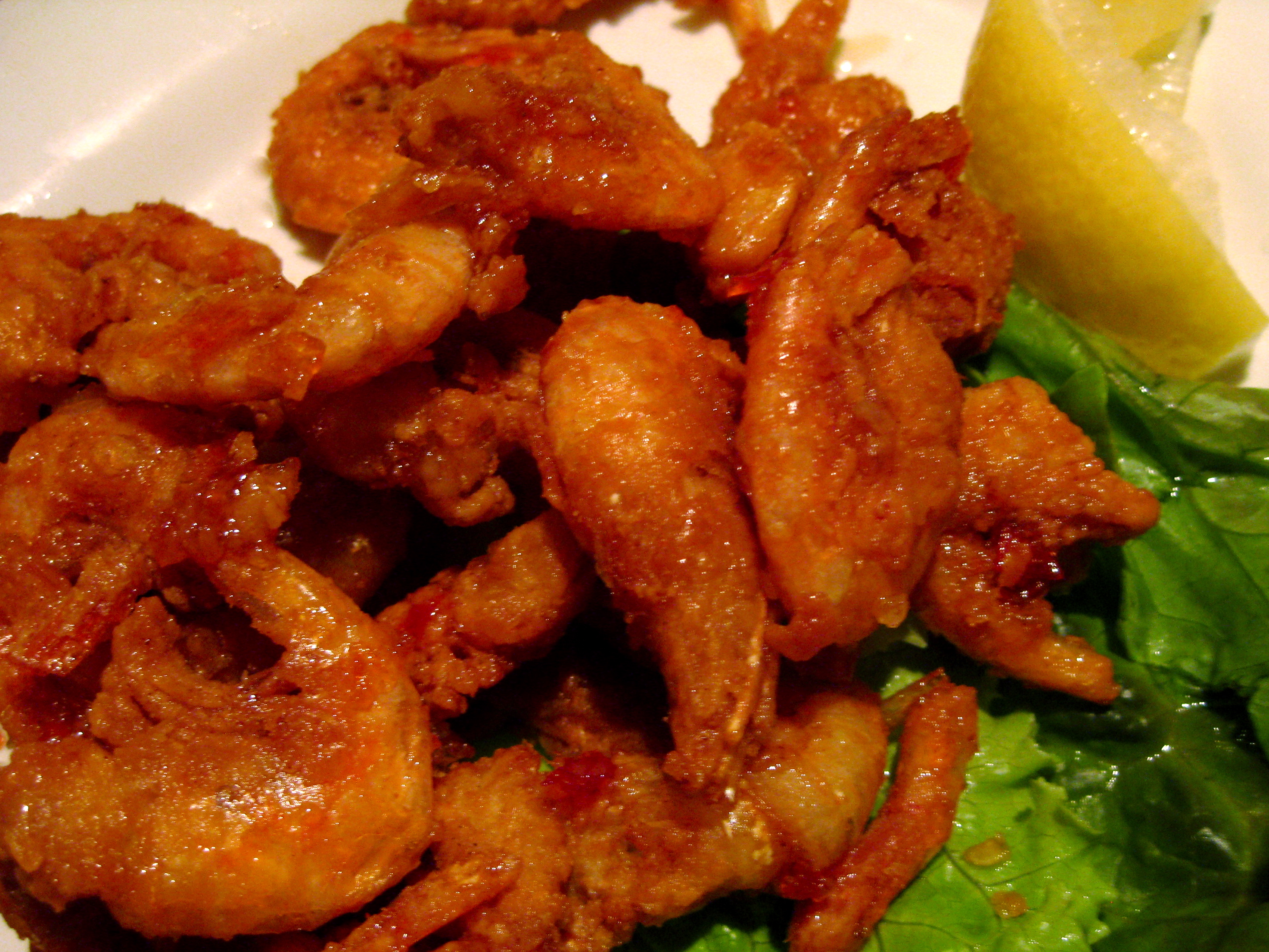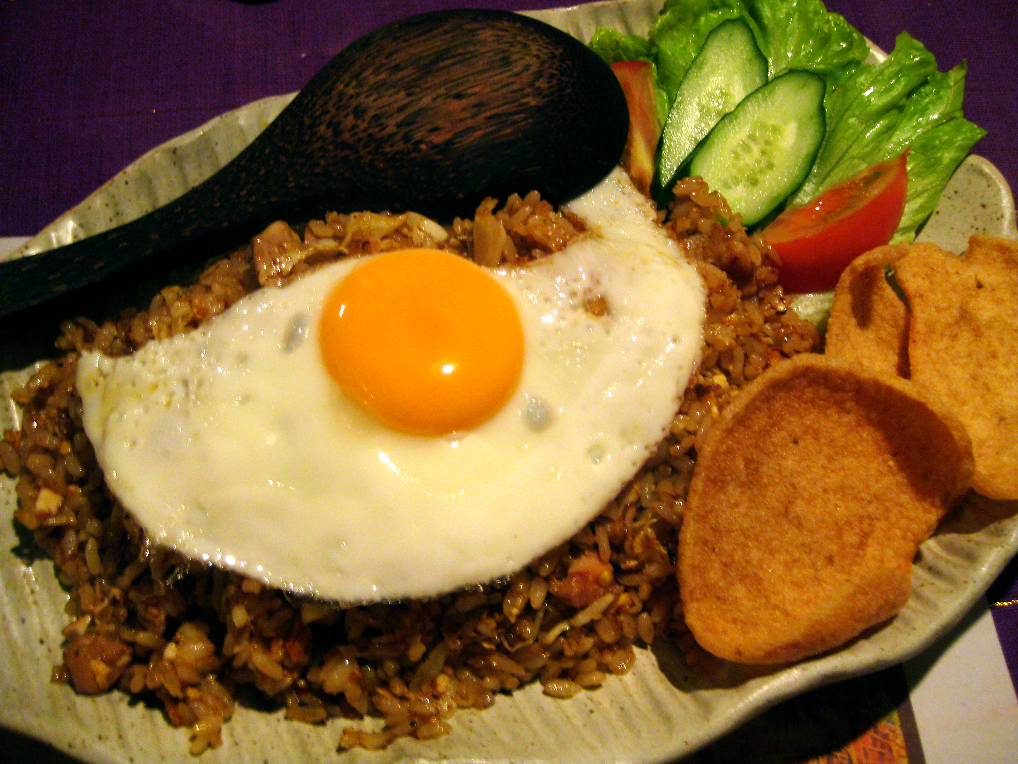 Indonesian nasi goreng (fried rice) with shrimp chips, and deep fried shrimp, in Okayama.