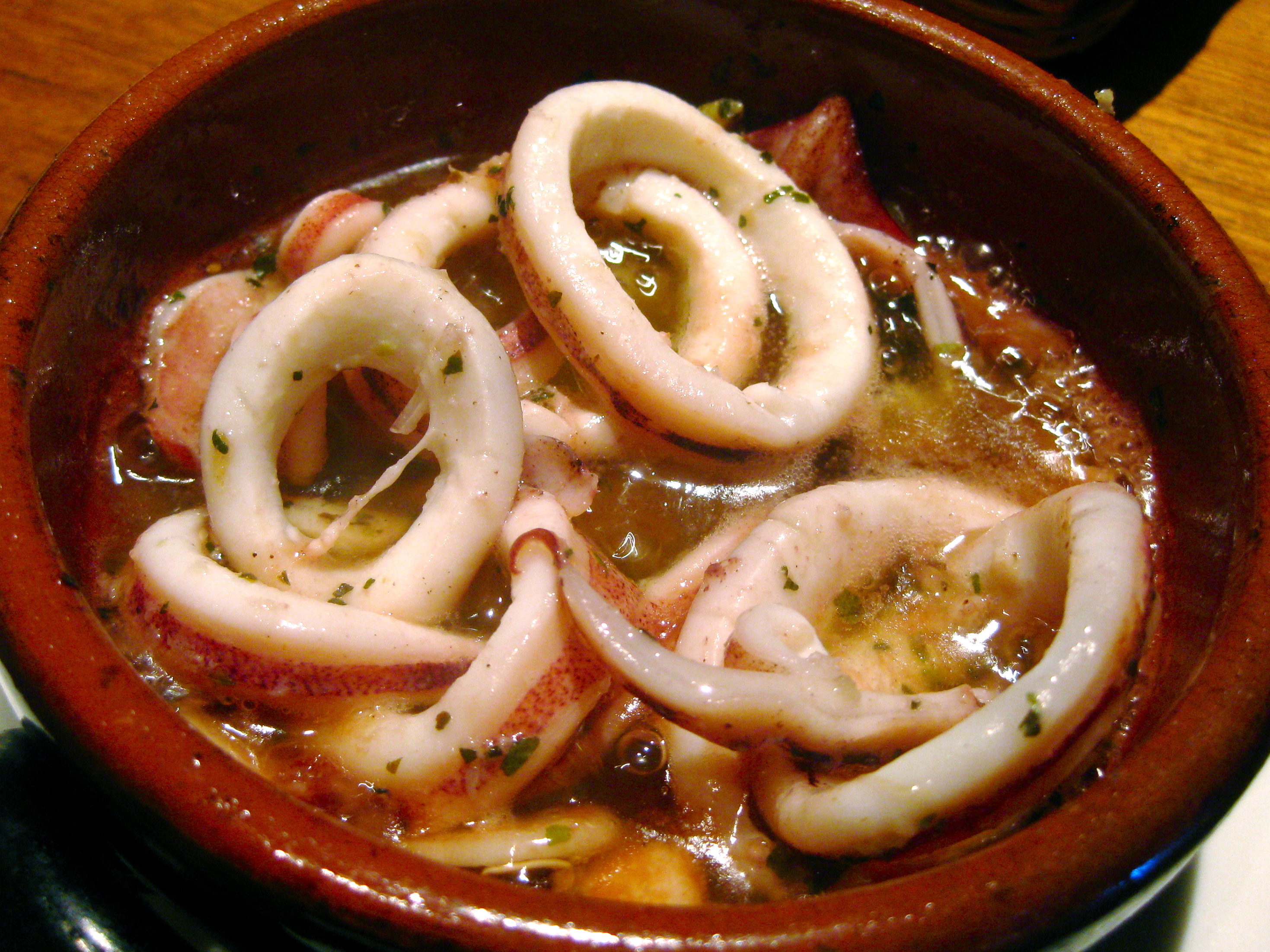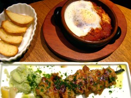 Tapas: squid in garlic olive oil, egg poached in tomato sauce, and skewered grilled chicken.