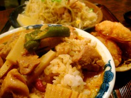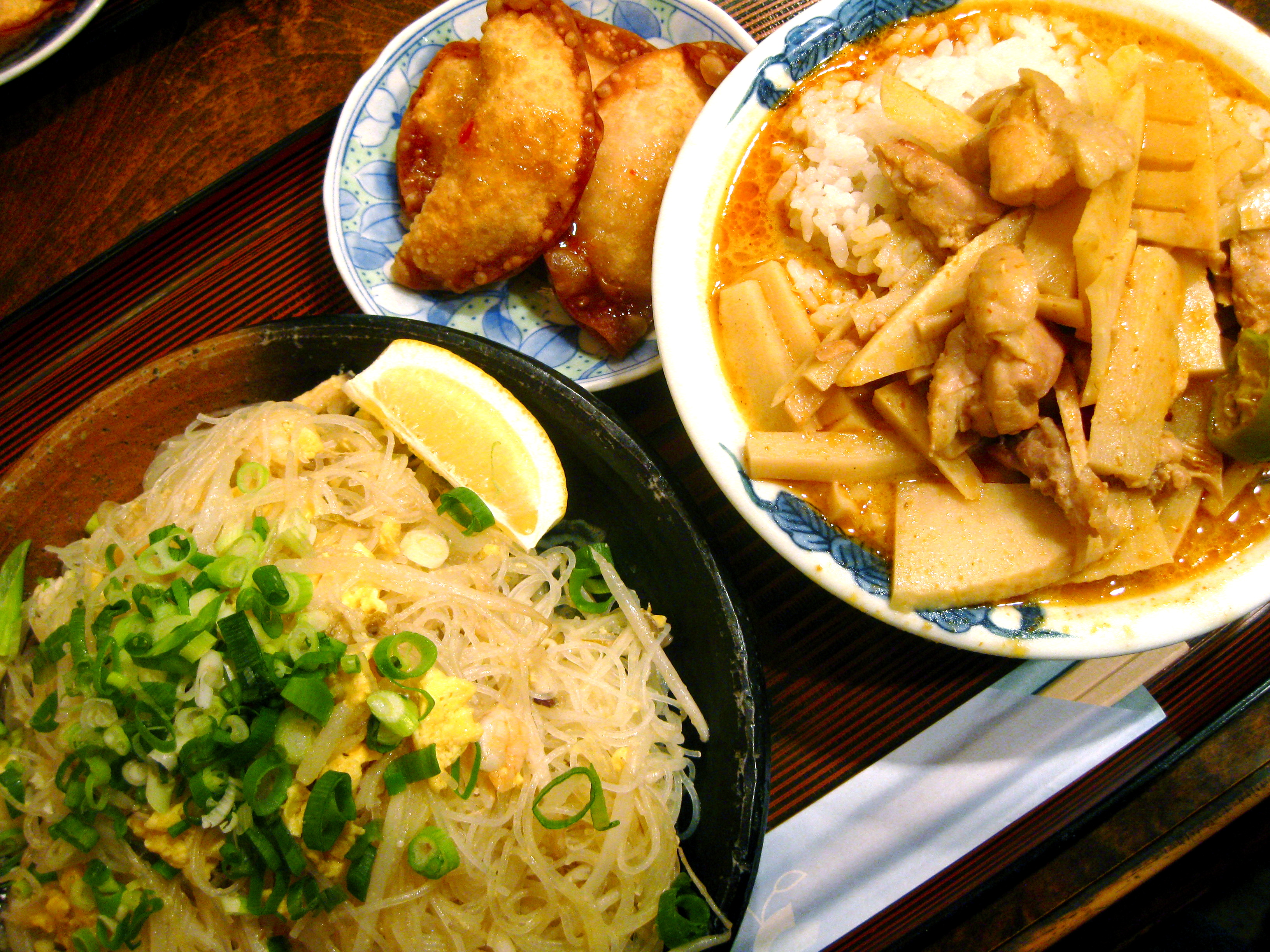 Segare’s awesome lunch set: Thai curry with chicken and fresh bamboo shoots, bifun rice noodles with squid, and deep fried shrimp dumplings in sweet chili sauce. (Pictured up top as well.)