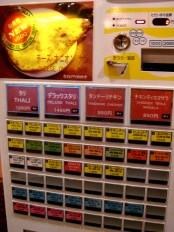 Ticket vending machine for menu items at an Indian restaurant; Curries, naan, and cabbage salad.