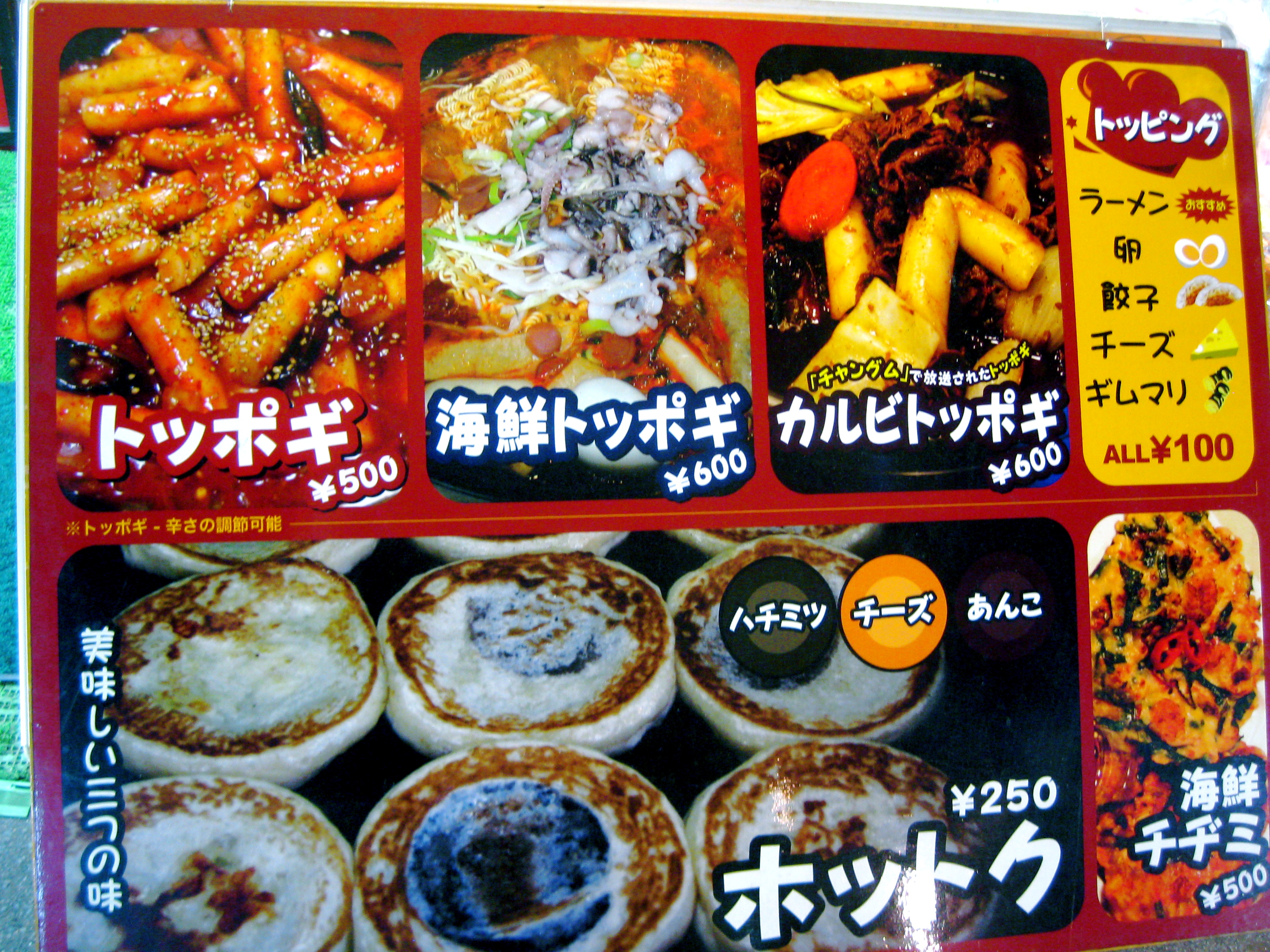 Korean steamed egg, and a sign advertising Korean street food on Ameyoko street in Ueno, Tokyo.