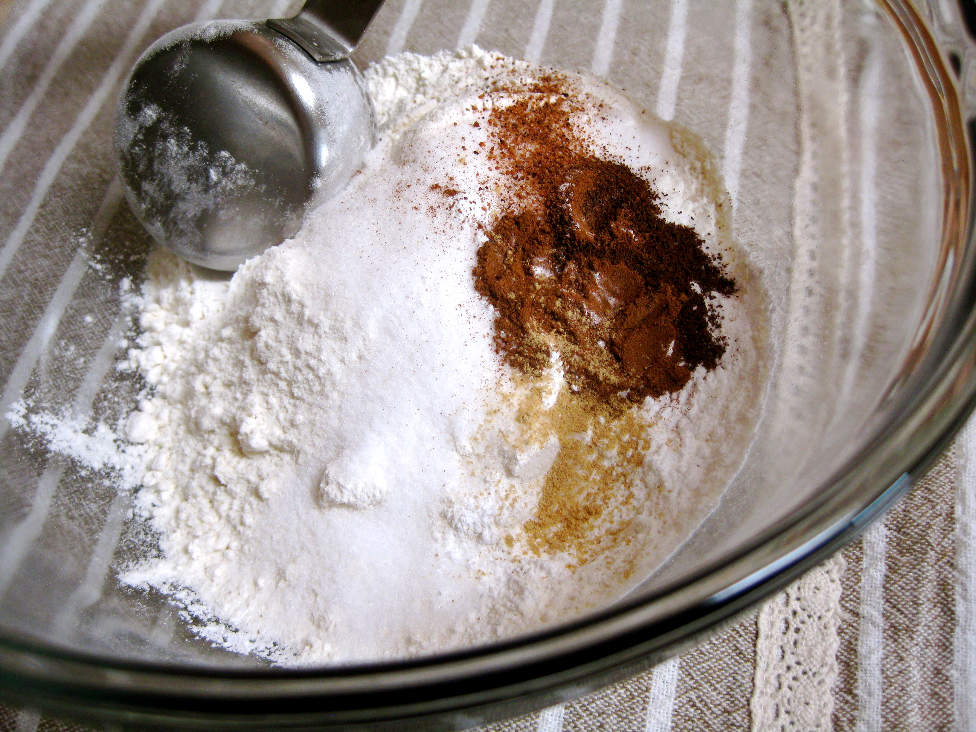 1. In a large bowl, mix together the dry ingredients: the flour, sugar, baking powder, salt, and other spices (or use about 1 tsp. of pumpkin pie spice).