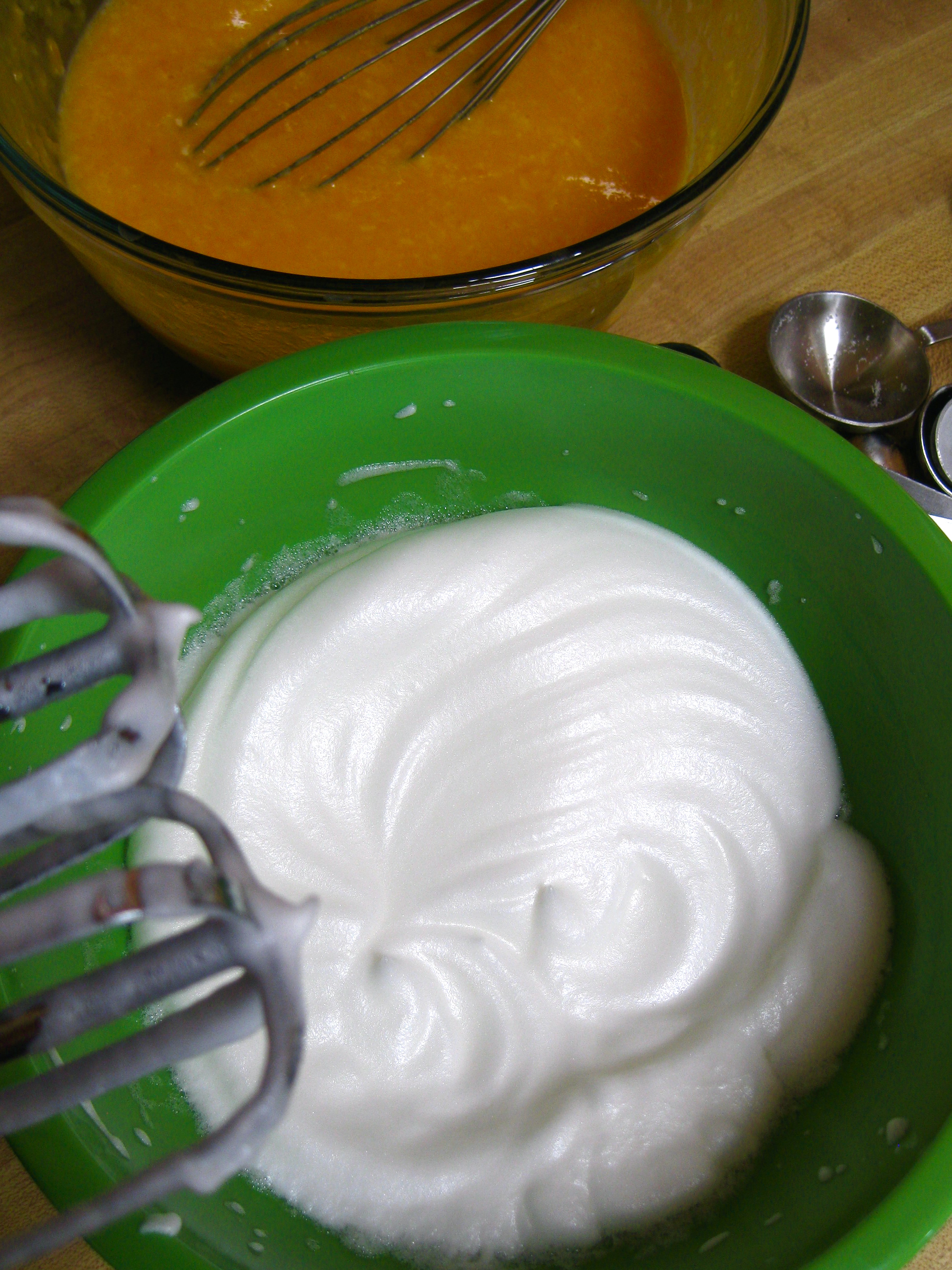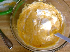 5. Pour the wet ingredients into the dry ingredients and gently mix. Then, even more gently, fold the egg whites into the batter until it is smooth and well-blended.