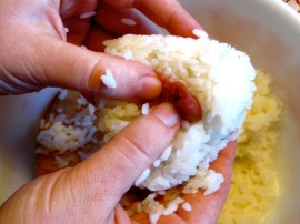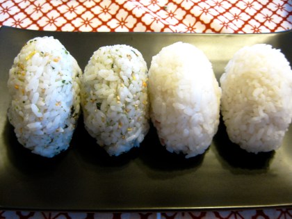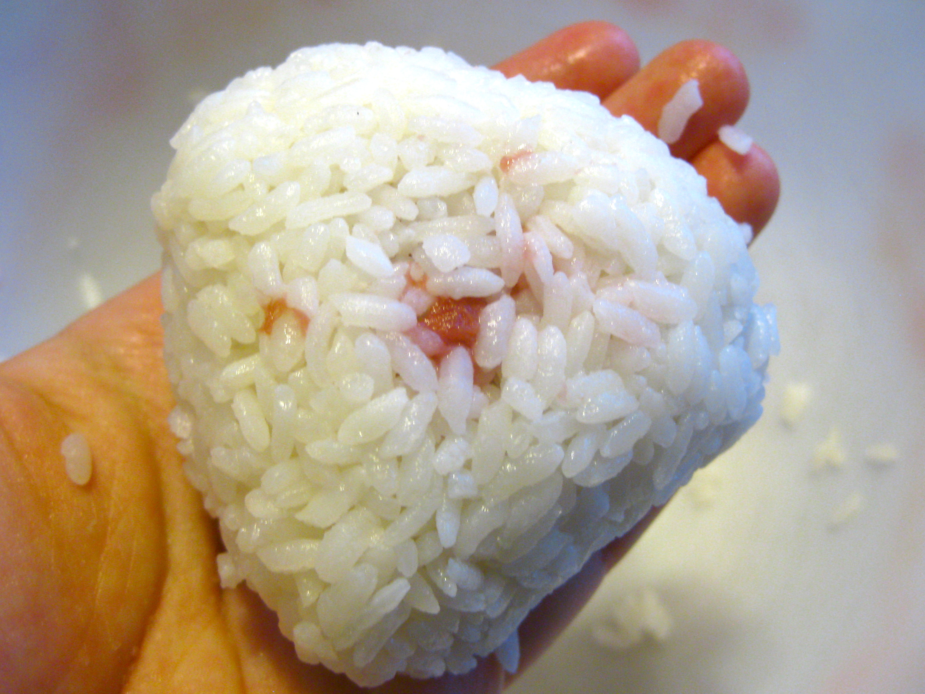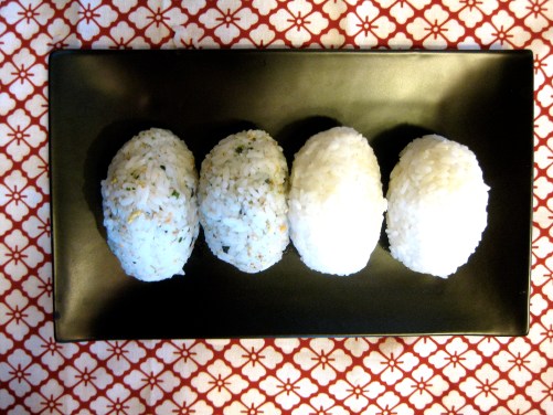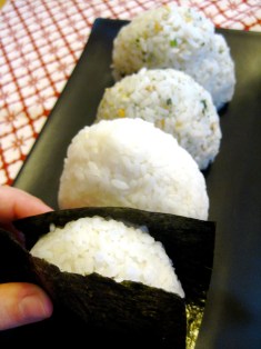 And let me emphasize the best part: they’re portable! I don’t restrict my onigiri-making to a way of using up leftovers; I also sometimes cook up a batch of rice intended purely for making rice balls to take to lunch the next day. All you need is plastic wrap, and later– optionally– seaweed, and you don’t even need to refrigerate them. In fact they’re better if you don’t.