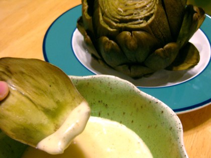 6. Test the artichoke periodically after 30 minutes by gently tugging on one of the leaves; when the leaves loosen and pop out easily, it’s done! Serve warm with the dipping sauce and/or a small dish of melted butter.