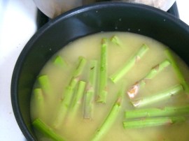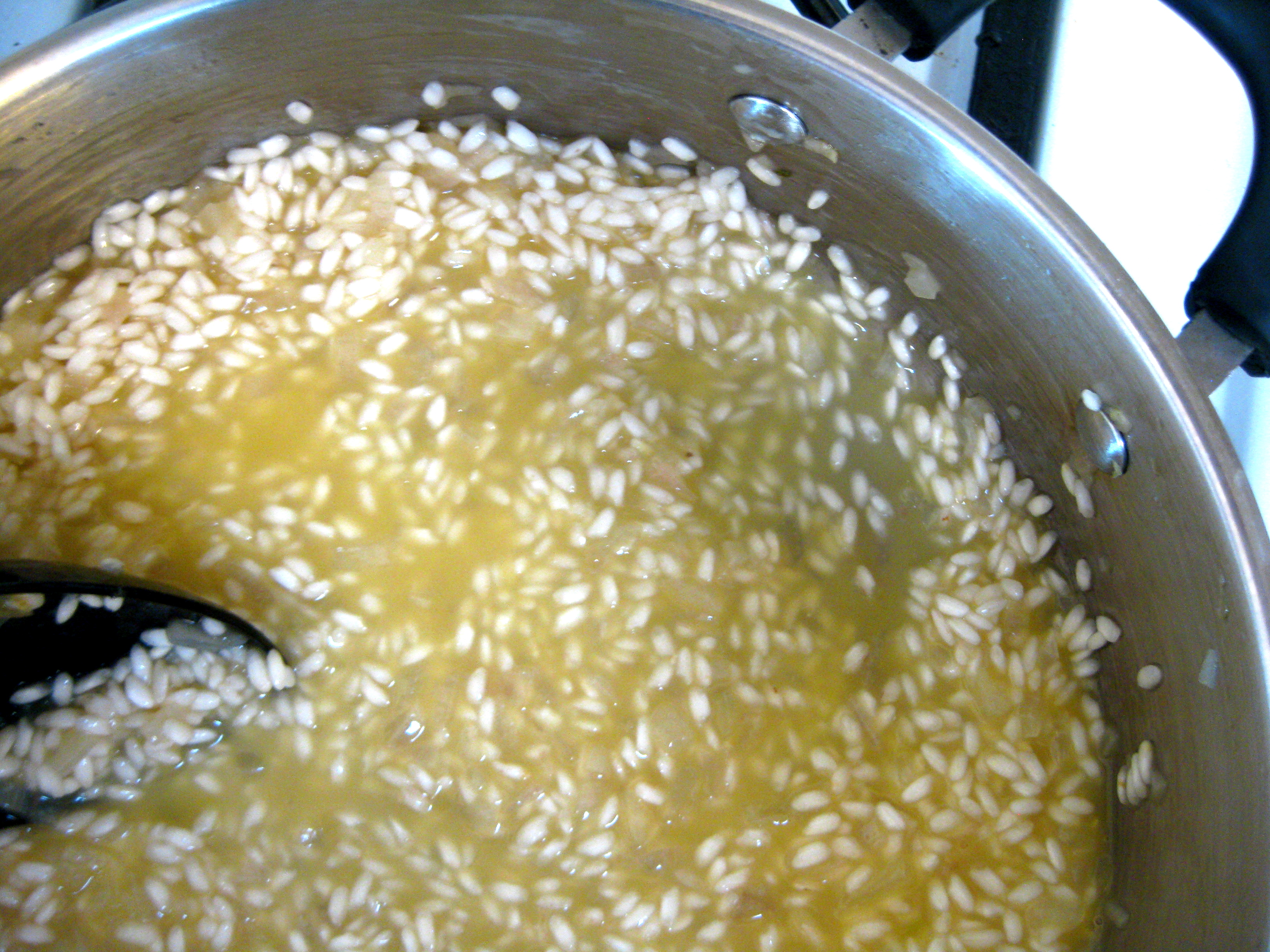 1. Start warming the vegetable or chicken stock in a small saucepan. (Linda says, “You can add the tough ends of your asparagus spears to your vegetable stock. This will give the risotto more flavor.”)